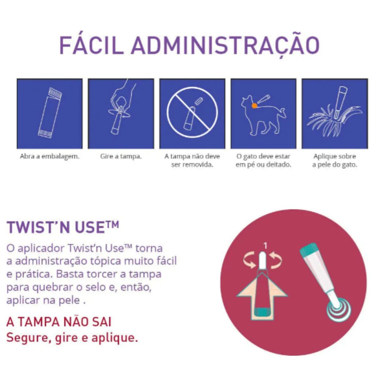 Retire a pipeta da embalagem e remova a tampa. Posicione o gato de forma confortável e afaste os pelos na base do crânio, entre as orelhas. Aplique todo o conteúdo da pipeta diretamente na pele. Evite banhos nas primeiras 72 horas após a aplicação para garantir absorção completa.