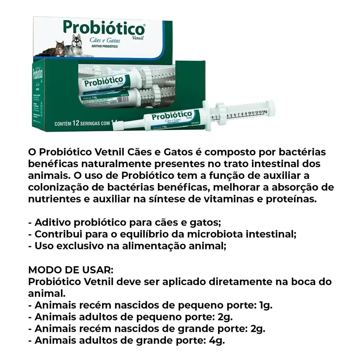 O Probiotico Vetnil e um suplemento alimentar de alta qualidade desenvolvido pela Vetnil, referencia no mercado veterinario brasileiro ha mais de 25 anos. Este aditivo probiotico em pasta foi especialmente formulado para auxiliar na regulacao da microbiota intestinal de caes e gatos, promovendo uma saude digestiva completa para seu pet.
