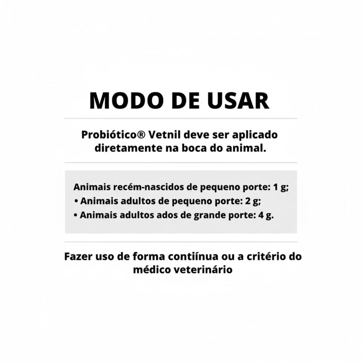 Composto por bacterias beneficas naturalmente presentes no trato intestinal dos animais, o Probiotico Vetnil atua na colonizacao de microorganismos essenciais, melhorando significativamente a absorcao de nutrientes e auxiliando na sintese de vitaminas e proteinas fundamentais para o organismo do seu companheiro.