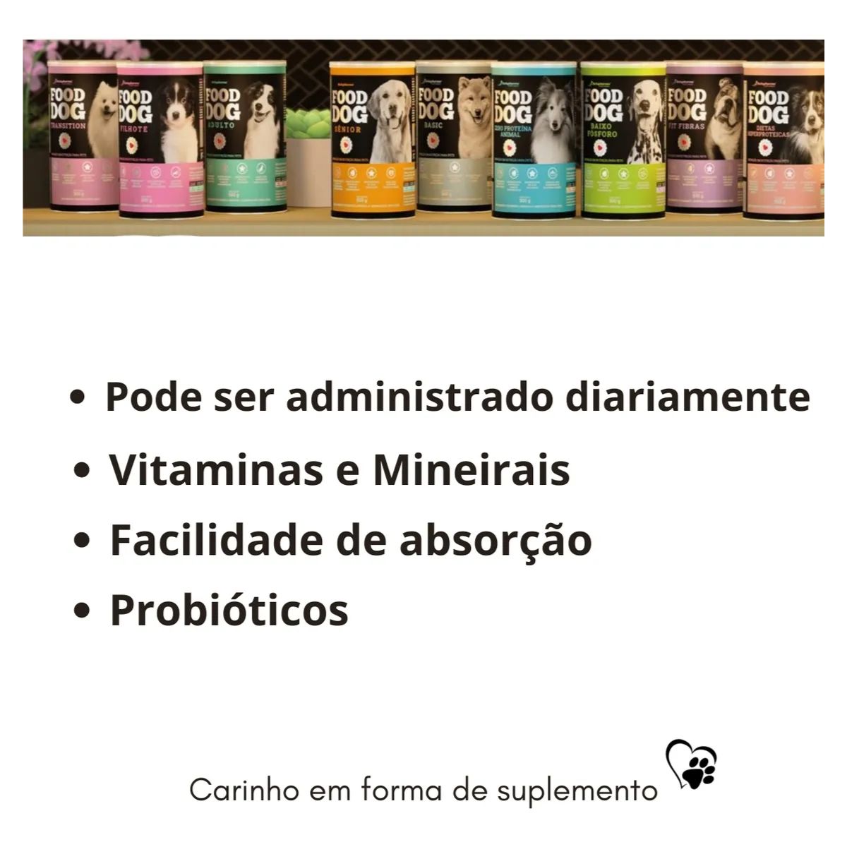Este suplemento balanceado foi criado para suprir deficiencias nutricionais da alimentacao convencional, promovendo saude integral do seu pet atraves de vitaminas, minerais e aminoacidos essenciais.