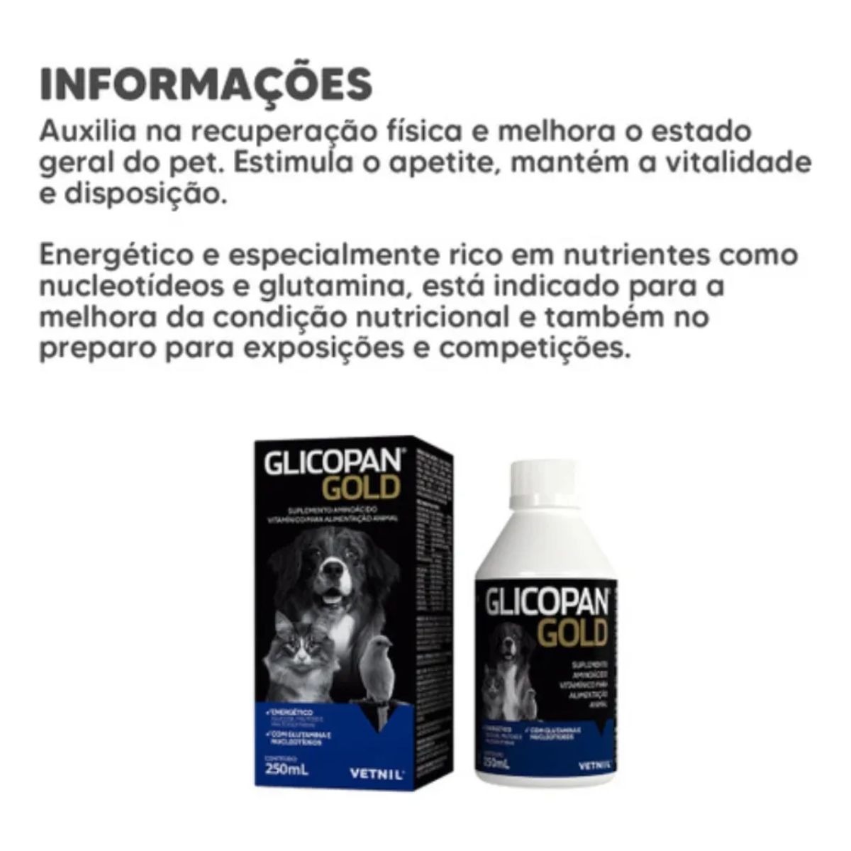 Desenvolvido pela Vetnil, uma das maiores e mais confiáveis indústrias farmacêuticas veterinárias do Brasil com mais de 30 anos de experiência, o Glicopan Gold é o suplemento completo que seu pet precisa para recuperar energia, fortalecer o sistema imunológico e manter a saúde em dia.