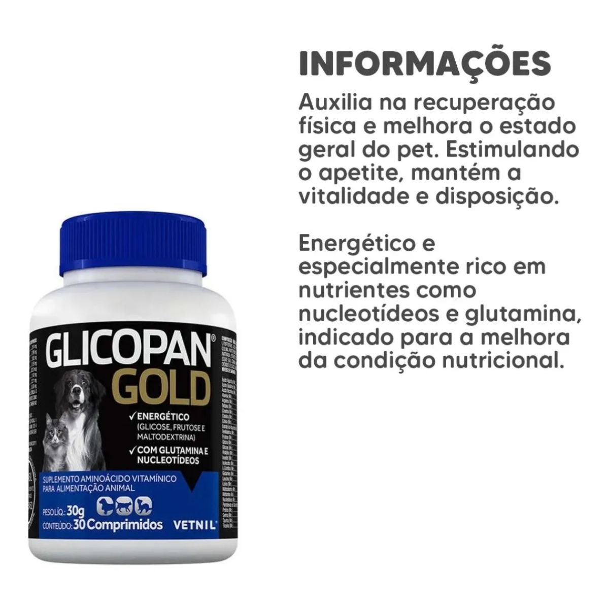 O Glicopan Gold é um suplemento vitamínico e aminoácido desenvolvido pela Vetnil, laboratório veterinário com mais de 40 anos de tradição no Brasil e referência em nutrição animal. Formulado especialmente para cães e gatos que necessitam de reforço nutricional, este produto combina vitaminas do complexo B, aminoácidos essenciais e minerais em comprimidos palatáveis que facilitam a administração.