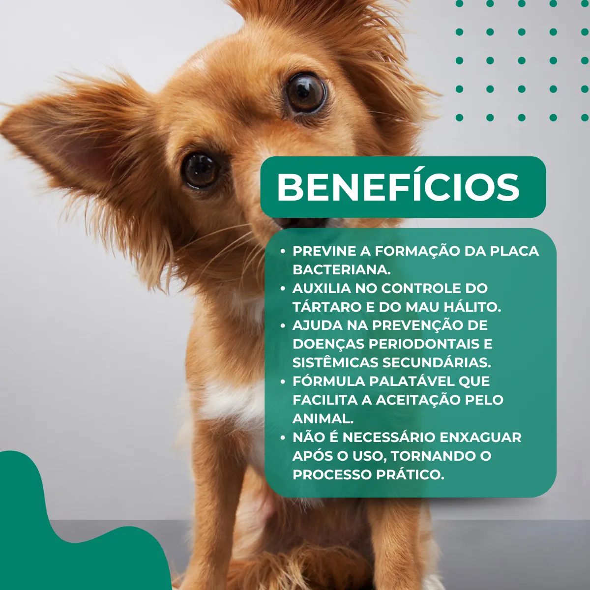 • Hálito Fresco Duradouro Ao combater a placa bacteriana e o tártaro, o kit elimina as fontes do mau hálito, proporcionando um hálito mais agradável para o seu pet e para o convívio familiar.