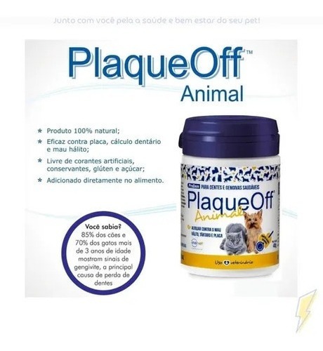 Manter a saúde bucal do seu pet nunca foi tão simples e eficaz. Plaque Off é um suplemento natural à base de algas marinhas, clinicamente testado e aprovado, que age diretamente na causa do tártaro e do mau hálito, promovendo uma limpeza completa e progressiva da boca do seu animal.