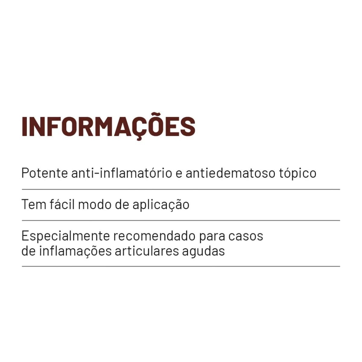 Sua fórmula exclusiva proporciona alívio rápido de inflamações, edemas e dores musculares, sendo ideal para animais atletas, em recuperação pós-cirúrgica ou que apresentam processos inflamatórios agudos.