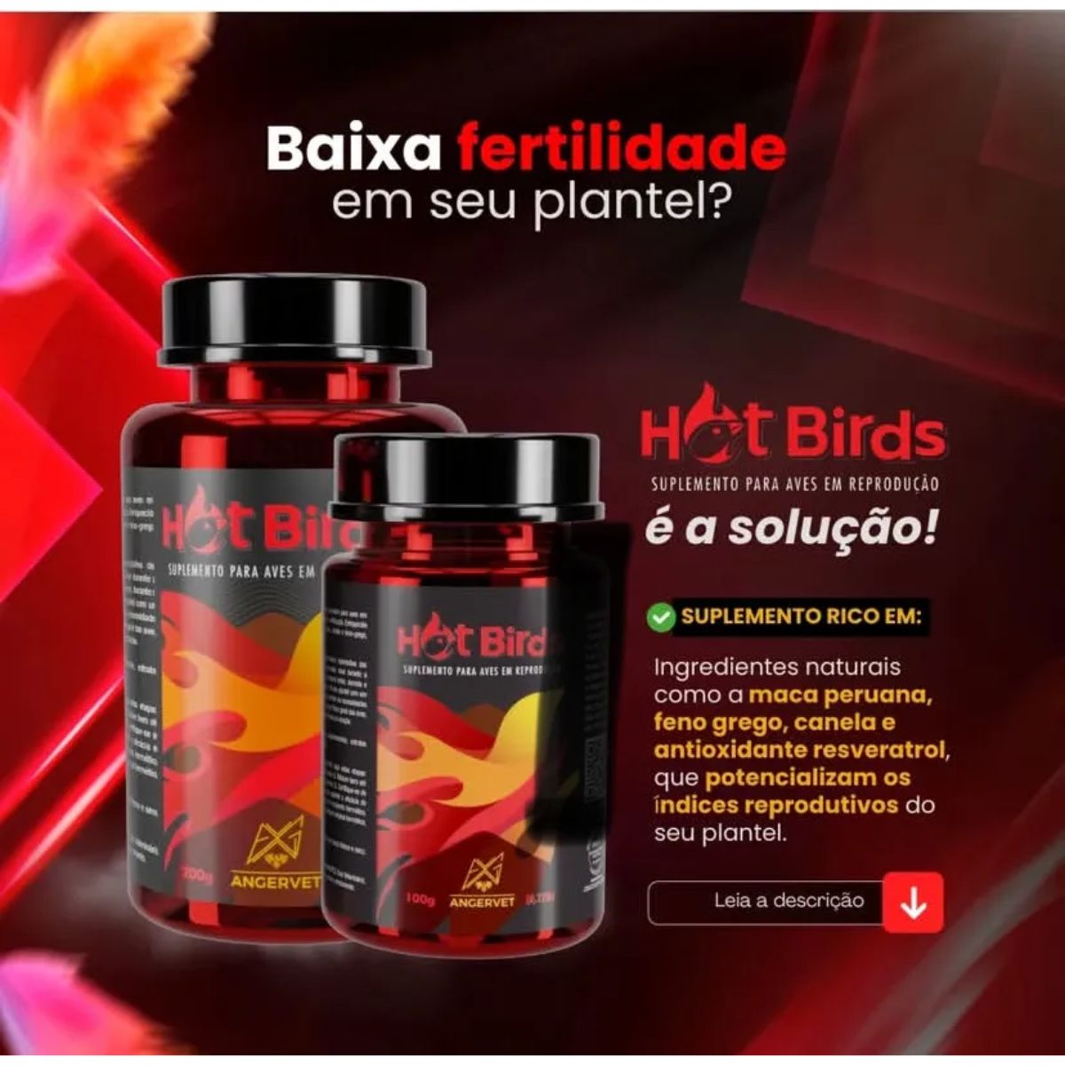 O Hot Birds da Angervet representa o que há de mais avançado em suplementação nutricional para aves em período reprodutivo. Se você busca aumentar a produtividade do seu plantel, melhorar a qualidade das suas aves e obter filhotes mais saudáveis e vigorosos, este é o suplemento que faltava na sua rotina de criação.