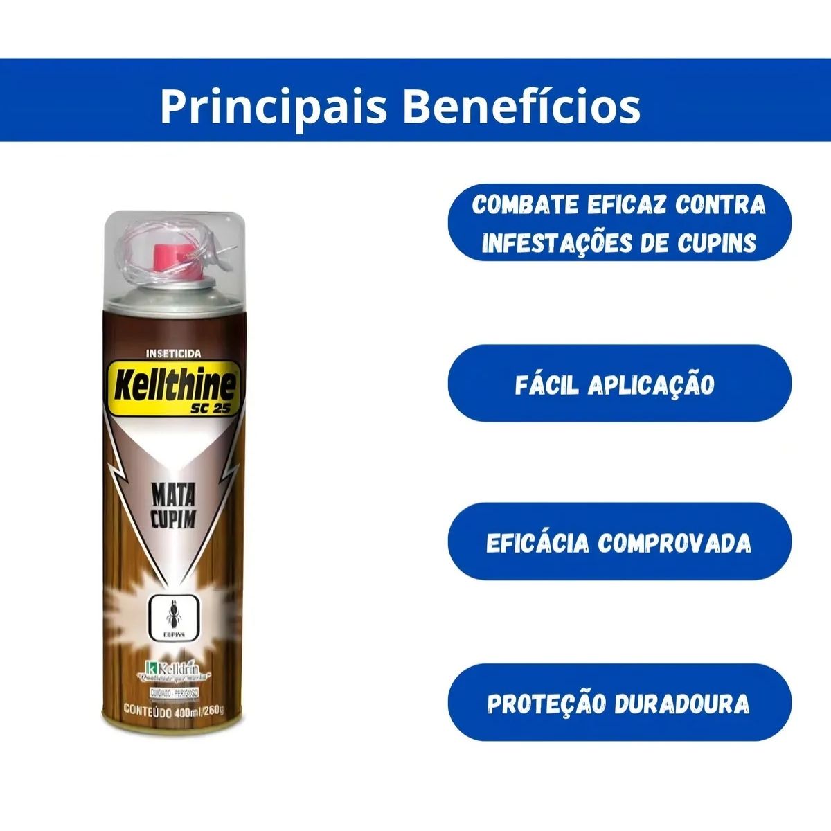O Spray Incolor 400ml SC25, desenvolvido pela renomada Kellthine, é a solução definitiva para proteger seus móveis e estruturas de madeira contra a ação devastadora dos cupins. Com uma fórmula avançada, este produto garante uma eliminação rápida e eficaz, atuando em todas as fases do ciclo de vida desses insetos, desde as formas mais jovens até a rainha.