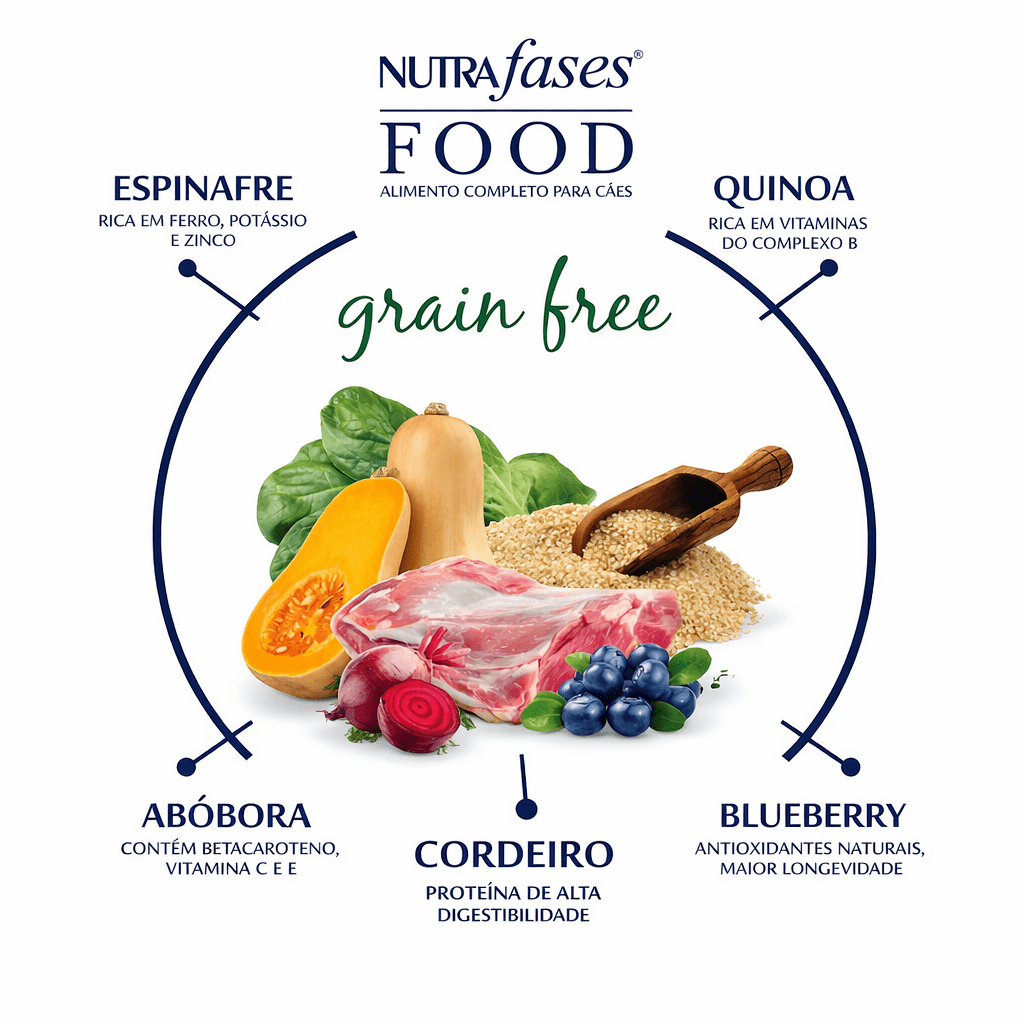 Cordeiro, abóbora, quinoa, blueberry, espinafre, linhaça, vitaminas (A, D3, E, B1, B2, B6, B12, ácido fólico), minerais (cálcio, fósforo, potássio, magnésio, ferro, zinco, selênio), antioxidantes naturais.
