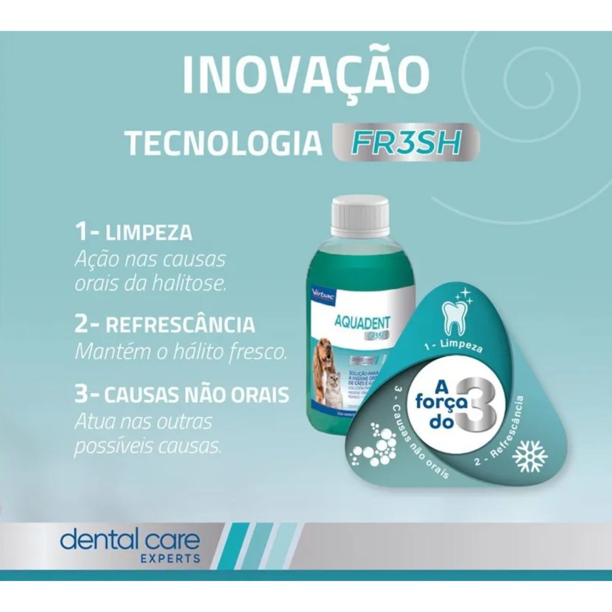 Com a exclusiva tecnologia FR3SH®, o Aquadent Fresh atua de forma eficaz no controle da placa bacteriana, principal causa do mau hálito e de problemas periodontais. Sua fórmula contém ingredientes naturais cuidadosamente selecionados: Eritritol, um adoçante natural que proporciona um efeito refrescante na boca; Inulina, um prebiótico natural que ajuda a controlar o mau hálito; e Extrato de Romã, um antioxidante natural que auxilia na prevenção da formação de placa. Proporcione ao seu melhor amigo uma boca mais saudável e um hálito agradável, de maneira simples e sem estresse.