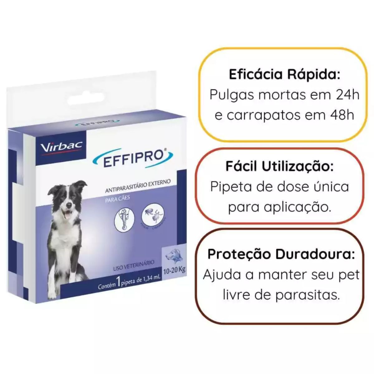 O Effipro da Virbac e um antiparasitario externo de alta eficacia desenvolvido especialmente para caes de medio porte entre 10 e 20 kg. Fabricado pela Virbac, multinacional francesa lider mundial em saude animal com mais de 60 anos de experiencia, o Effipro garante protecao completa e duradoura para seu pet.