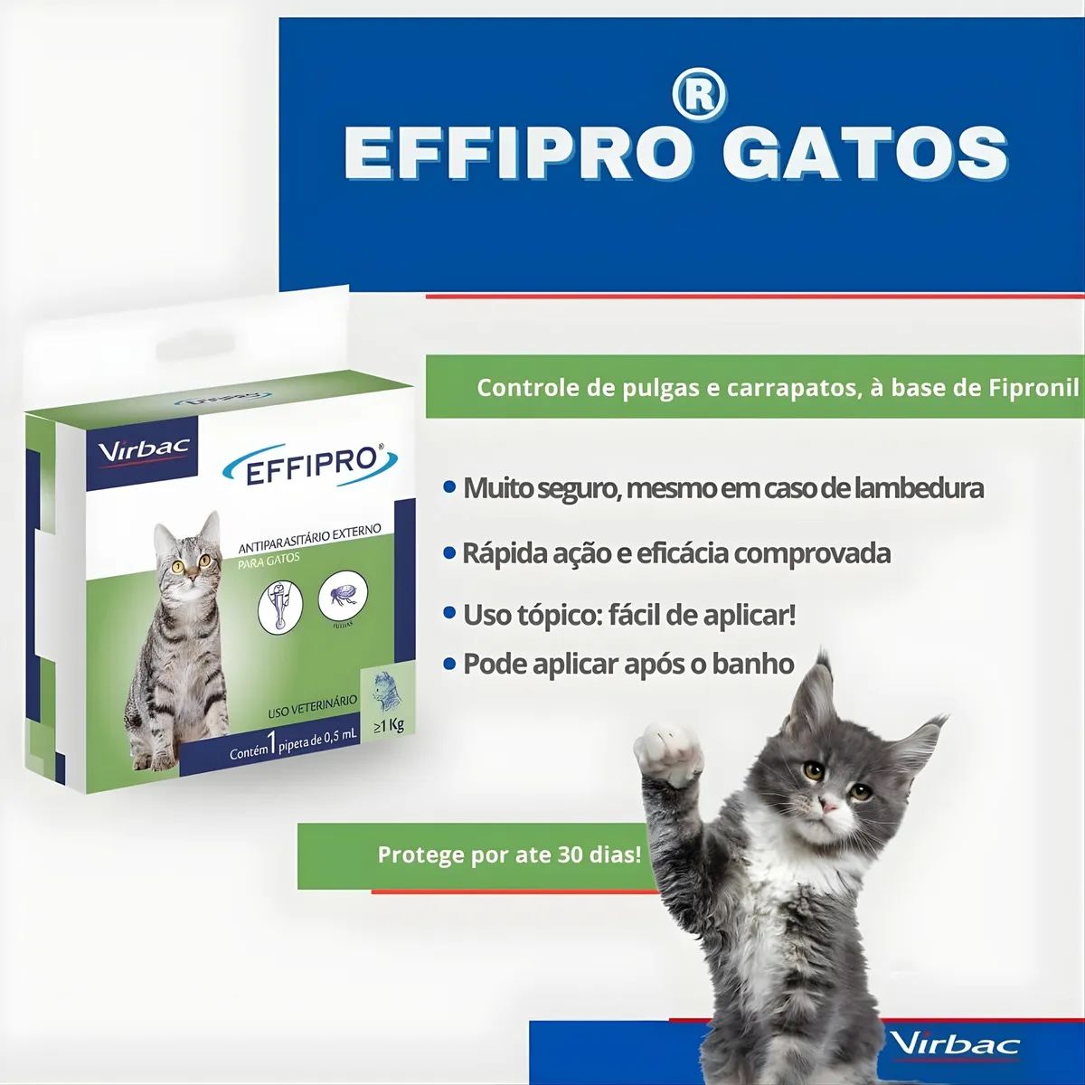 O Effipro é a solução desenvolvida pela Virbac, laboratório veterinário de referência mundial, para eliminar e prevenir infestações de pulgas e carrapatos em gatos. Com tecnologia de ponta e fórmula de ação prolongada, cada pipeta oferece até 4 semanas de proteção contínua, garantindo o bem-estar do seu pet.