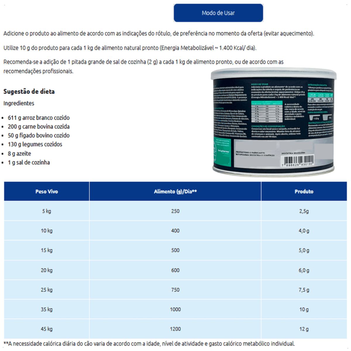 Este suplemento balanceado foi criado para suprir deficiencias nutricionais da alimentacao convencional, promovendo saude integral do seu pet atraves de vitaminas, minerais e aminoacidos essenciais.