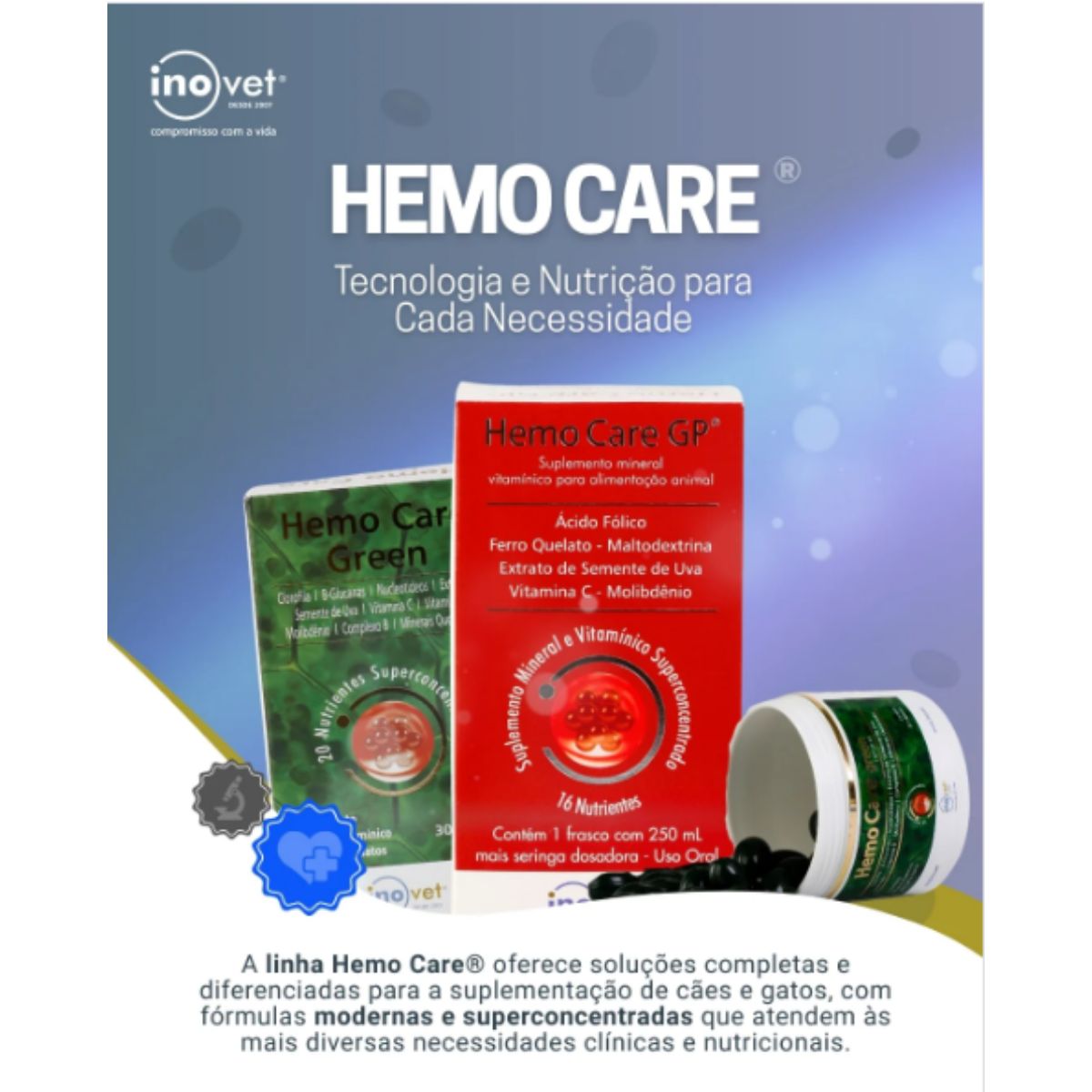 A Inovet é reconhecida nacionalmente pela qualidade de seus produtos veterinários, desenvolvidos com rigoroso controle de qualidade e fórmulas cientificamente testadas. O Hemo Care GP utiliza ferro quelato, forma de ferro com absorção superior ao sulfato ferroso comum, garantindo resultados mais rápidos e eficazes.
