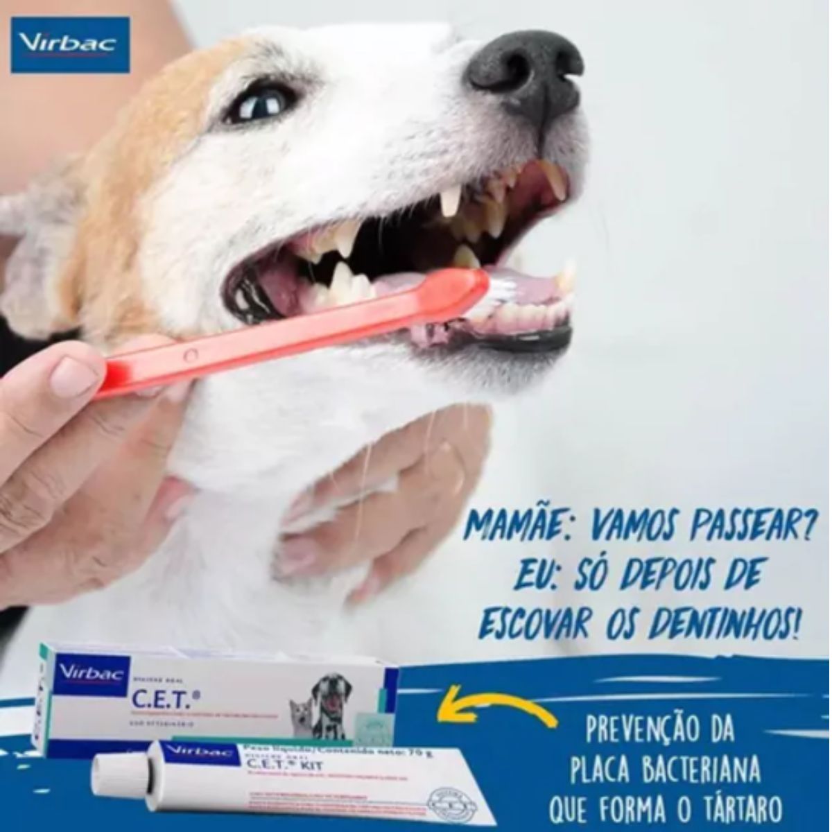 • Saúde Bucal Otimizada A pasta enzimática Virbac C.E.T. atua na quebra de resíduos alimentares e bactérias, promovendo uma limpeza profunda e prevenindo o acúmulo de placa e tártaro, que são as principais causas de doenças periodontais.