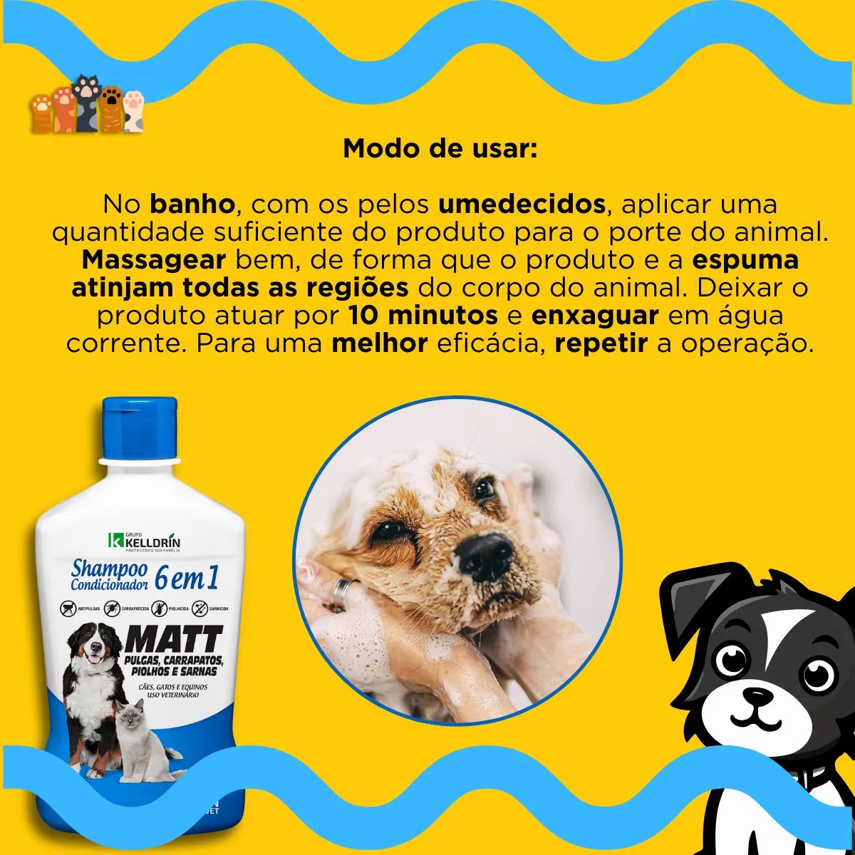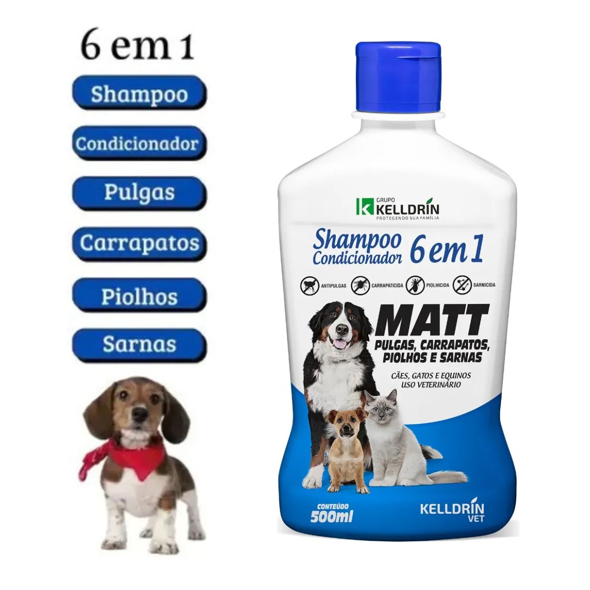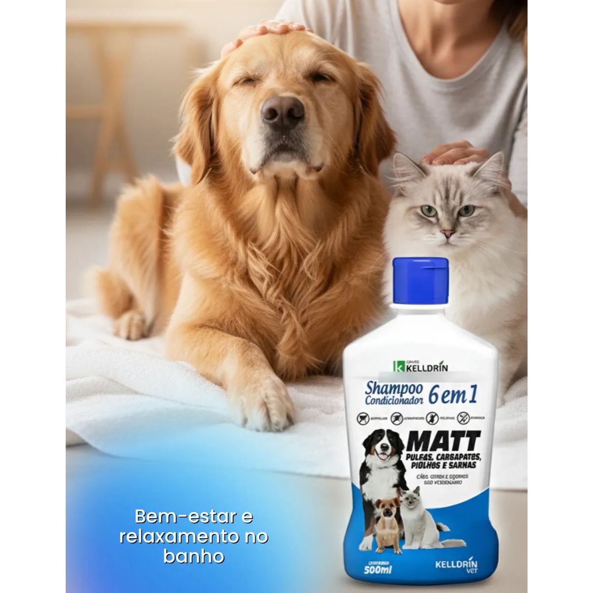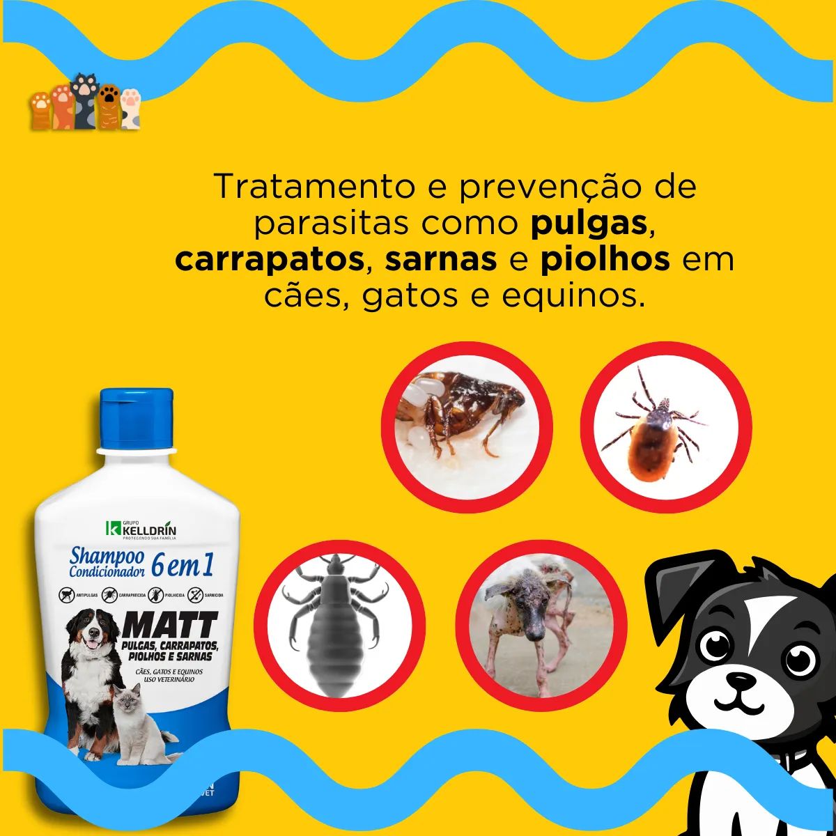O Shampoo e Condicionador MATT Pulgas Kelldrin funciona como ectoparasiticida para tratamento e prevencao de parasitas como pulgas, carrapatos, sarnas e piolhos em caes, gatos e equinos. Desenvolvido por Kelldrin, referencia nacional em produtos veterinarios, este shampoo oferece solucao completa em um unico produto.