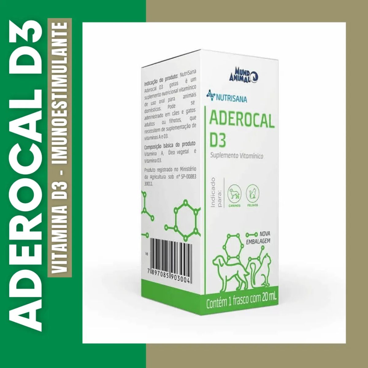 Aderocal D-23 Nutrisana é um suplemento vitamínico em gotas desenvolvido especialmente para cães e gatos, adultos ou filhotes, que precisam de um reforço essencial em vitamina A e D3.