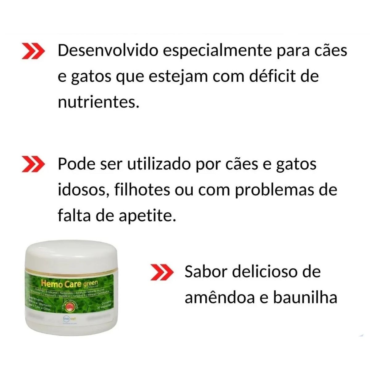 Seu cão ou gato merece o melhor cuidado, especialmente nos momentos em que precisa de força extra. O Hemo Care Green Inovet é o suplemento ideal para pets atletas ou em recuperação nutricional, com 20 nutrientes superconcentrados que promovem uma resposta rápida e eficaz.