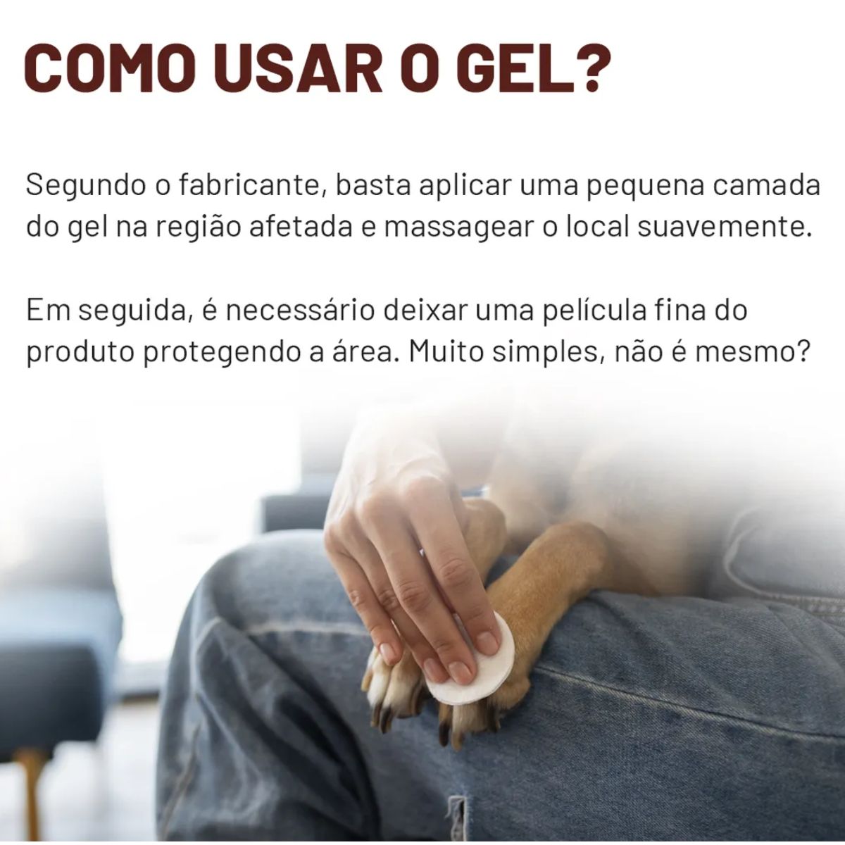 Aplique uma camada fina de DM Gel diretamente sobre a área afetada, realizando leve massagem para facilitar a absorção. Recomenda-se aplicar de 2 a 3 vezes ao dia ou conforme orientação do médico veterinário. Lave as mãos após a aplicação.