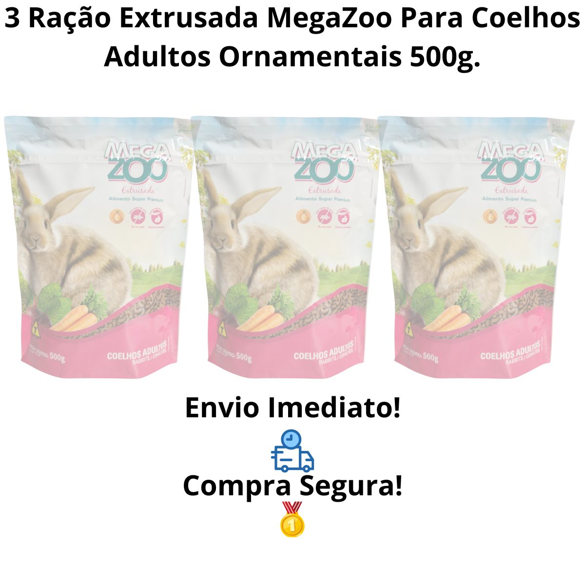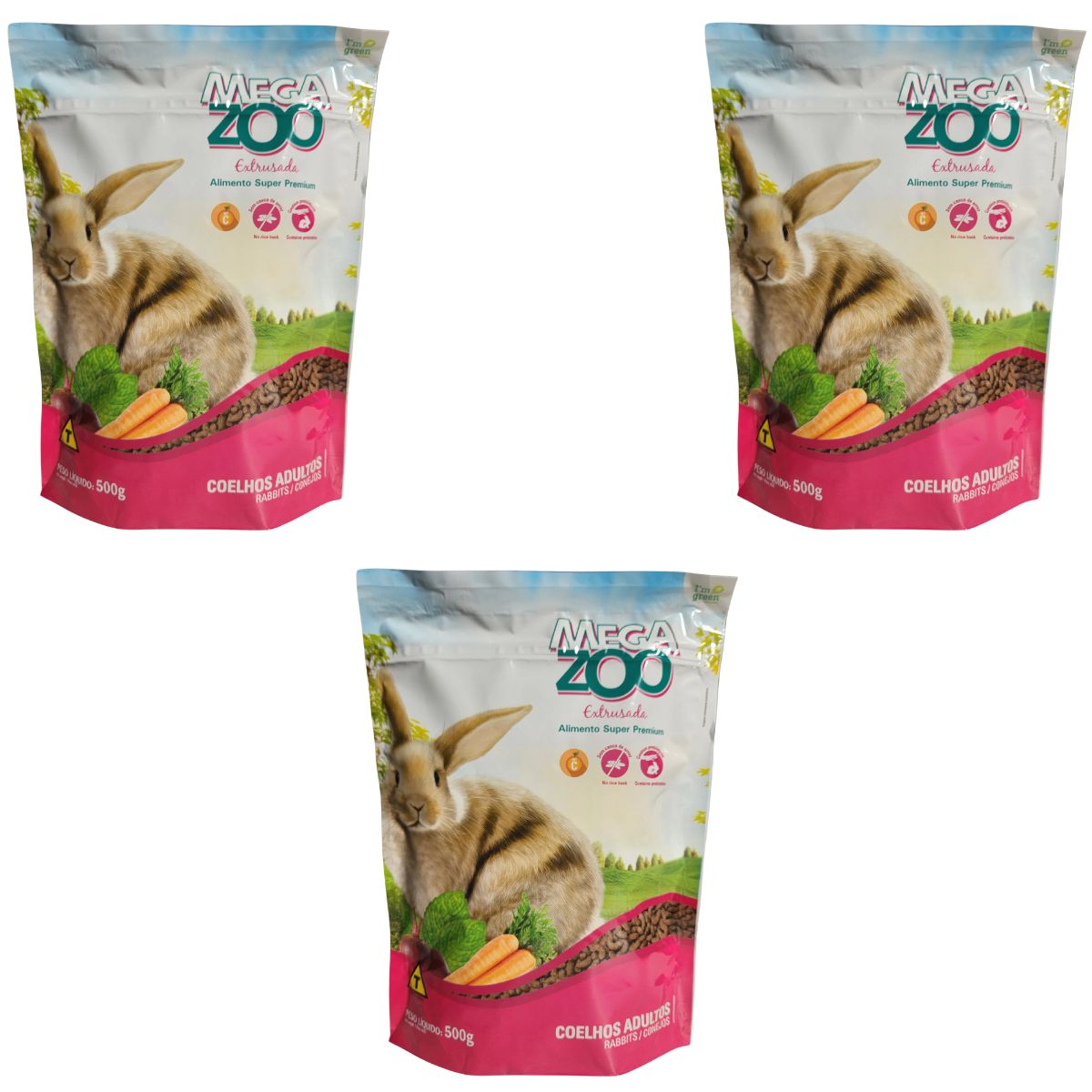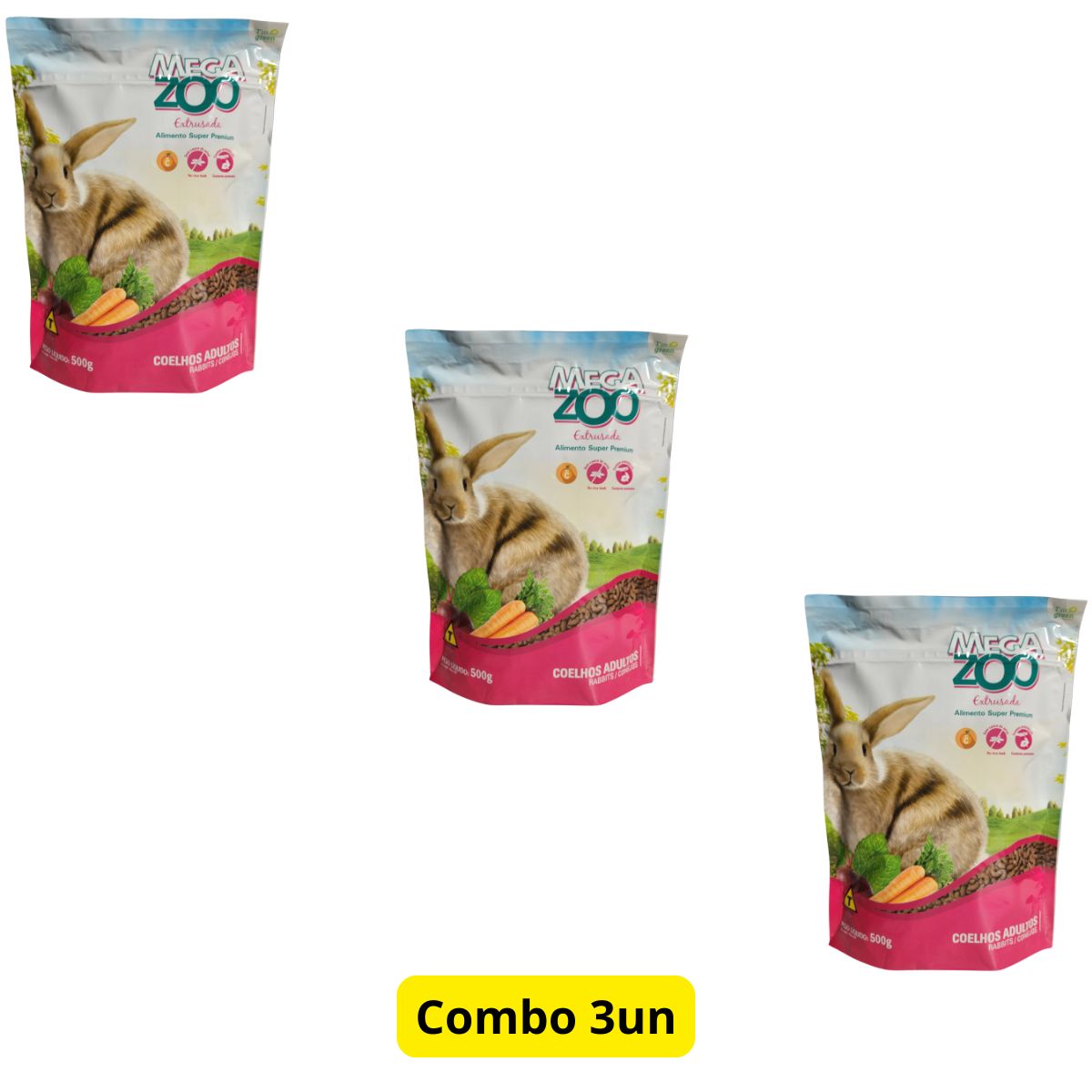 3 Unidades RACAO EXTRUSADA MEGAZOO PARA COELHOS ORNAMENTAIS ADULTOS 500G