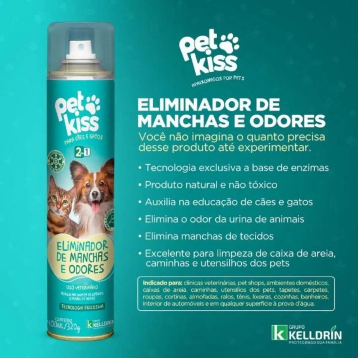 Desenvolvido pela Kelldrin, referência nacional em produtos veterinários e pet care com mais de 25 anos de experiência, o Pet Kiss Eliminador de Mancha e Odor 2 em 1 representa a tecnologia mais avançada para higienização de ambientes com animais de estimação.