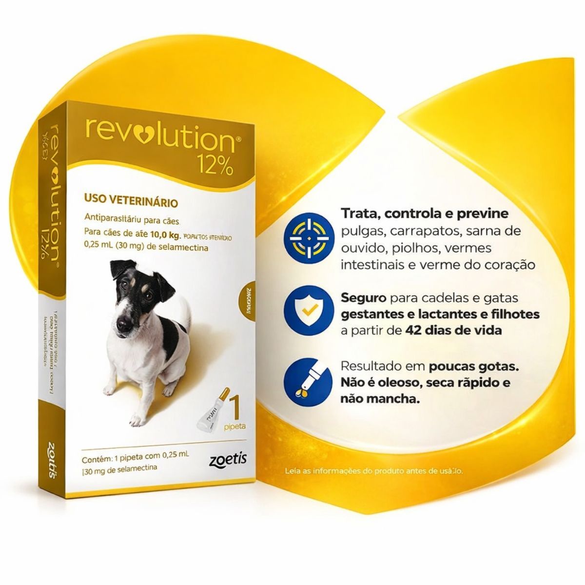 Este tratamento tópico de fácil aplicação é ideal para cães de 5,1 a 10 kg, proporcionando proteção mensal contra pulgas, carrapatos, sarnas (de ouvido e sarcóptica), piolhos e vermes intestinais. Sua fórmula exclusiva com Selamectina atua de forma rápida e duradoura, interrompendo o ciclo de vida das pulgas e prevenindo novas infestações. Além disso, é resistente à água, permitindo que seu pet continue com suas atividades normais sem perder a proteção. O Revolution também auxilia no controle da dirofilariose.