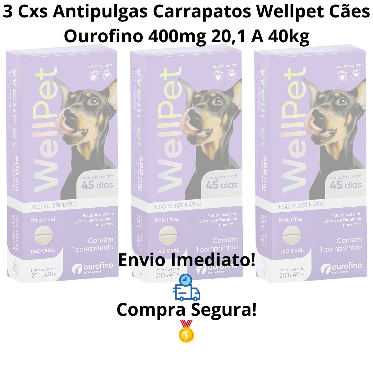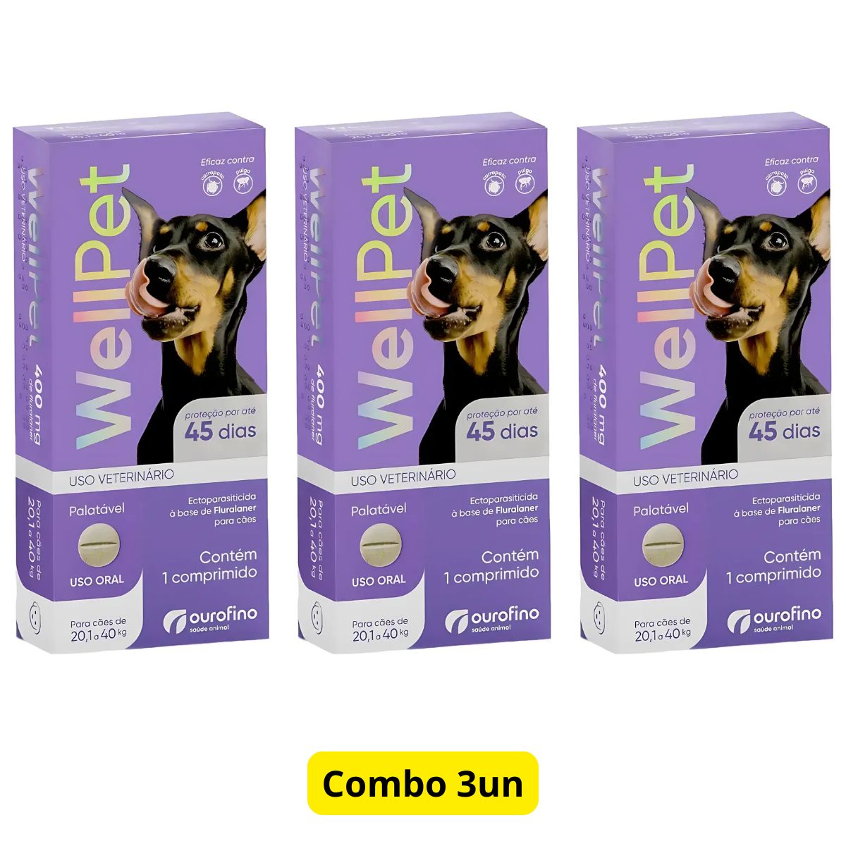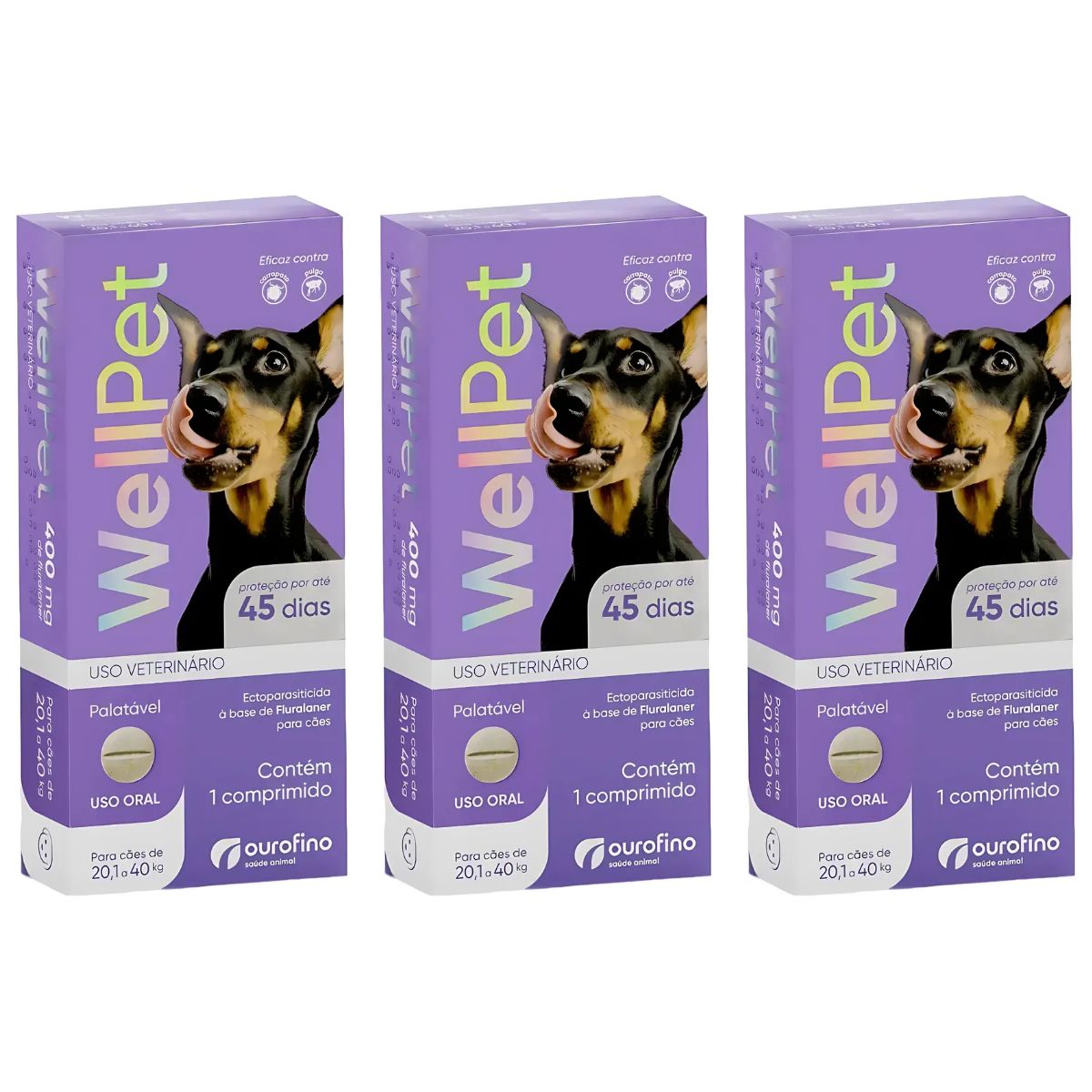 3 Unidades WELLPET 400MG – ANTIPULGAS E CARRAPATOS PARA CÃES DE 20,1 A 40KG – OUROFINO