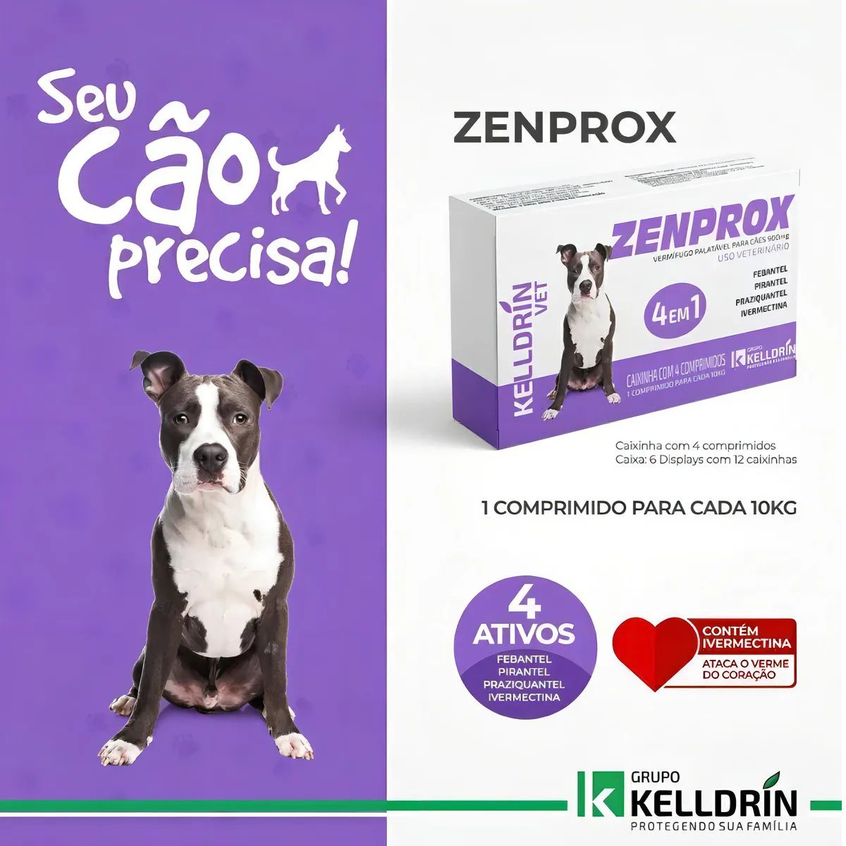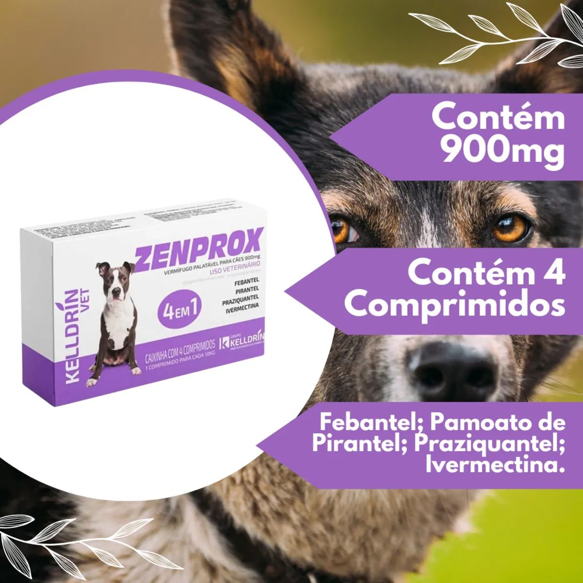 O Zenprox 900mg é um vermífugo de amplo espectro desenvolvido pela Kelldrin, laboratório veterinário reconhecido nacionalmente pela excelência em saúde animal. Este medicamento combina praticidade e eficácia máxima no controle de parasitas intestinais em cães de médio porte.
