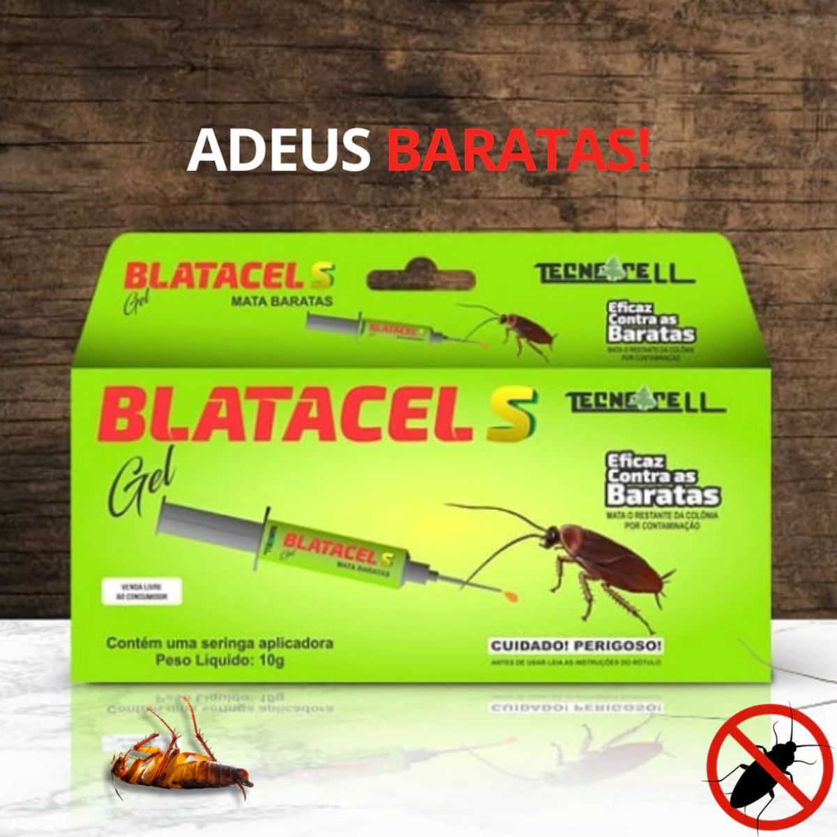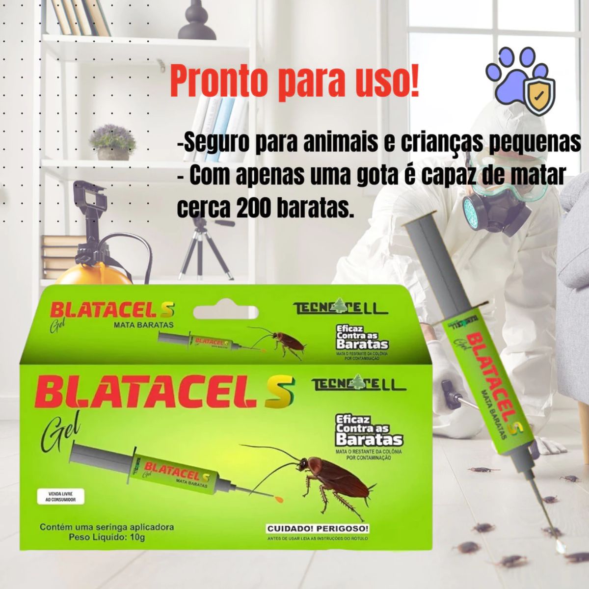 Modo de Usar: Blatec Gel, inseticida de pronto uso, utilizado no controle de baratas em ambientes domésticos, comerciais, industriais e locais públicos. O produto é envasado em seringas com 10 g da formulação. Para aplicá-lo basta retirar a tampa do bico da seringa e apertar o êmbolo, depositando pequenas gotas do produto em pontos próximos aos esconderijos das baratas, ou próximo aos locais onde elas se alimentam ou transitam. A quantidade de produto a ser aplicada deve ser equivalente a 0,6 g/m2, ou aproximadamente 6 a 8 pontos de aplicação por m2. Após o uso do produto a tampa do bico da seringa deve ser recolocada para guarda do restante do produto, que deve ser guardado em local ao abrigo de temperatura excessiva, FORA DO ALCANCE DE CRIANÇAS E ANIMAIS DOMÉSTICOS.