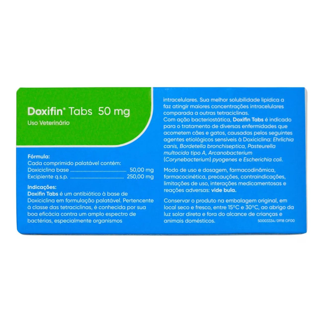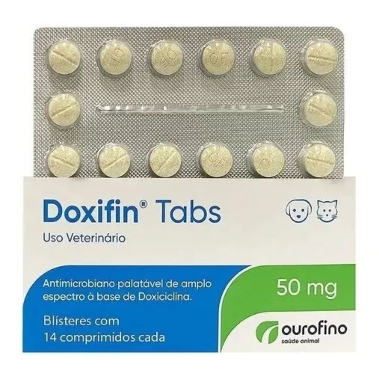 Cada embalagem contém 14 comprimidos de 50mg, formulados para combater uma ampla gama de infecções bacterianas. O Doxifin é indicado para o tratamento de doenças como leptospirose, infecções urinárias, respiratórias e de pele, proporcionando um alívio rápido e efetivo para o seu pet.