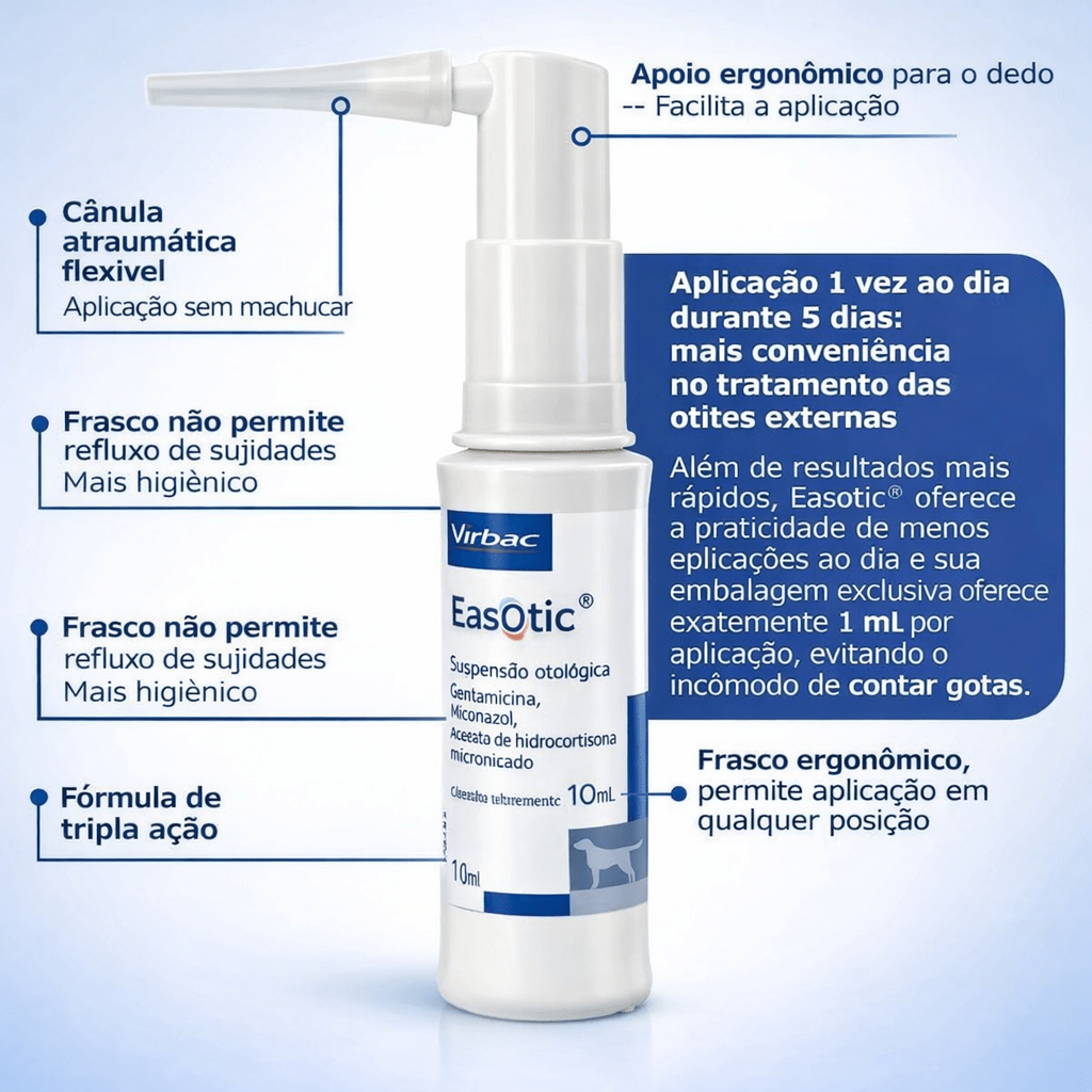 • “Testei outros produtos antes sem sucesso. O Easotic da Virbac resolveu a otite do meu Cocker em poucos dias. A orelha que estava vermelha e inchada voltou ao normal rapidamente.” – Keila Manara, Rio de Janeiro – Março/2026