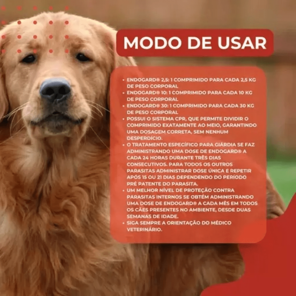 Administre o comprimido diretamente na boca do seu cão ou misturado à ração, sem a necessidade de jejum prévio. A dosagem é de 1 comprimido para cada 30 kg de peso corporal. Consulte sempre um médico veterinário para a correta indicação e frequência de uso, garantindo a saúde ideal do seu pet. Este produto é seguro para filhotes a partir de 15 dias de vida, fêmeas gestantes e lactantes.