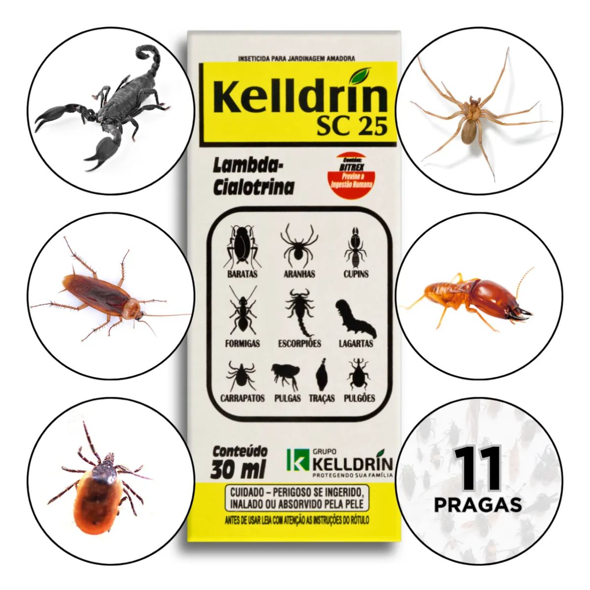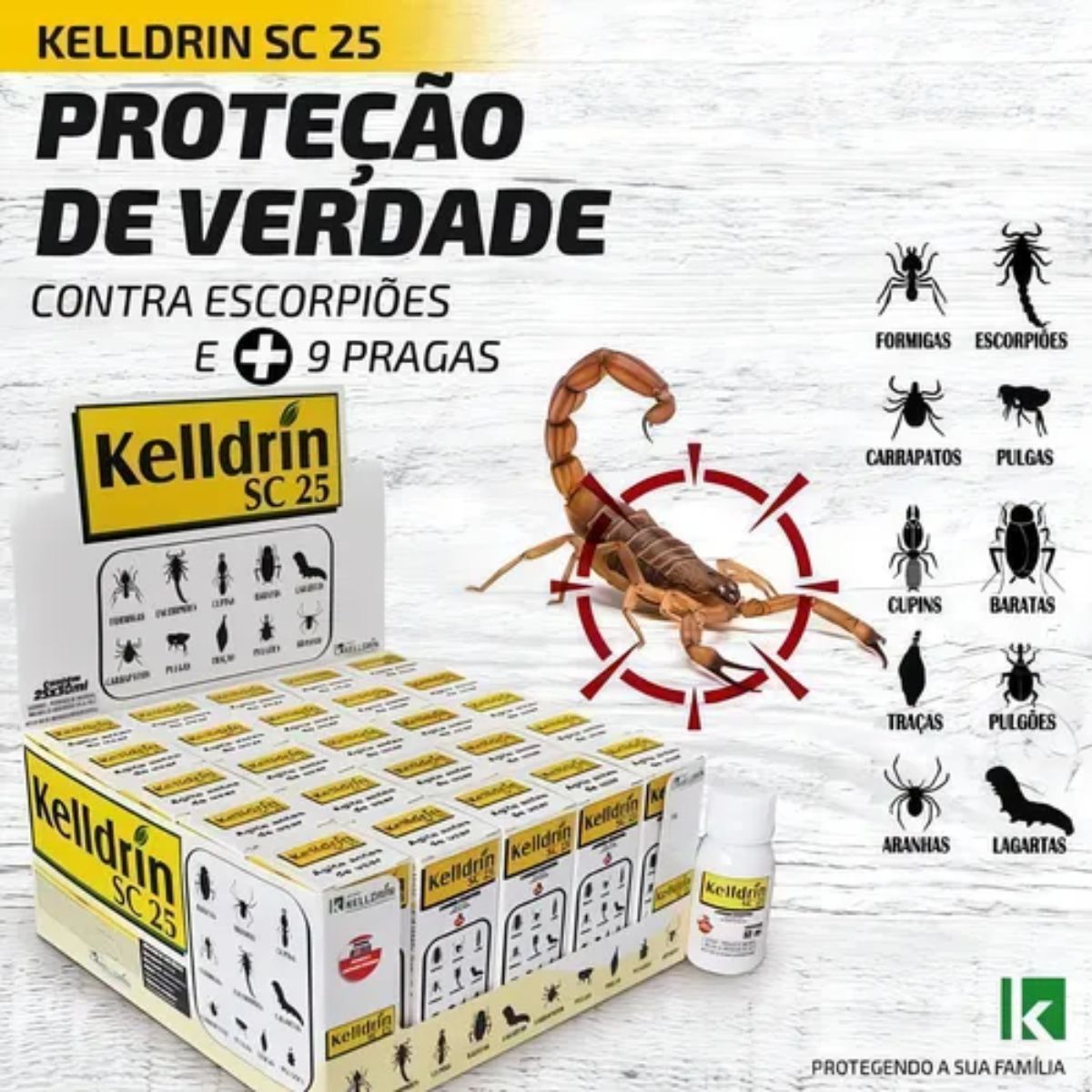 Não permita que baratas, aranhas, escorpiões e outras pragas prejudiquem sua qualidade de vida. Com Kelldrin SC 25, você pode desfrutar de um ambiente livre de infestações, garantindo segurança e conforto para você e sua família.