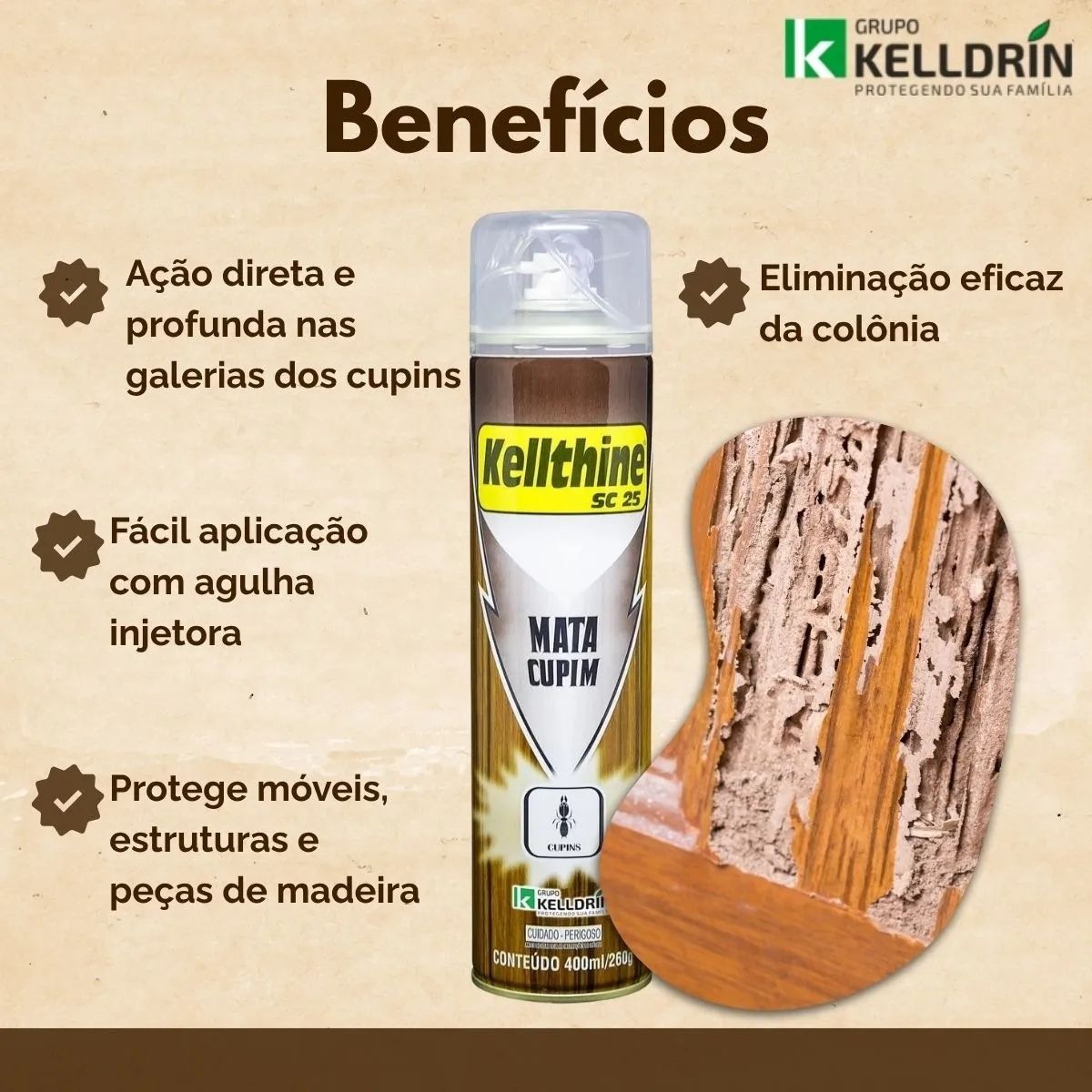 •Eficácia Comprovada: Elimina cupins de forma rápida e eficiente, protegendo sua madeira contra infestações futuras.