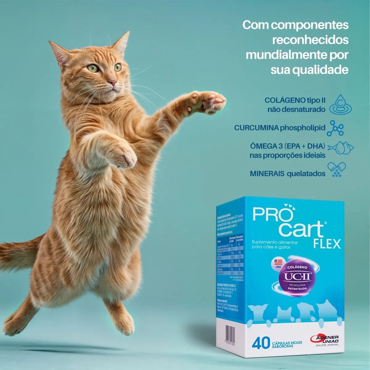 Procart® Flex é um suplemento premium desenvolvido especialmente para cães e gatos que precisam de cuidados articulares e suporte nutricional completo. Sua fórmula exclusiva combina ingredientes de alta tecnologia e eficácia comprovada: