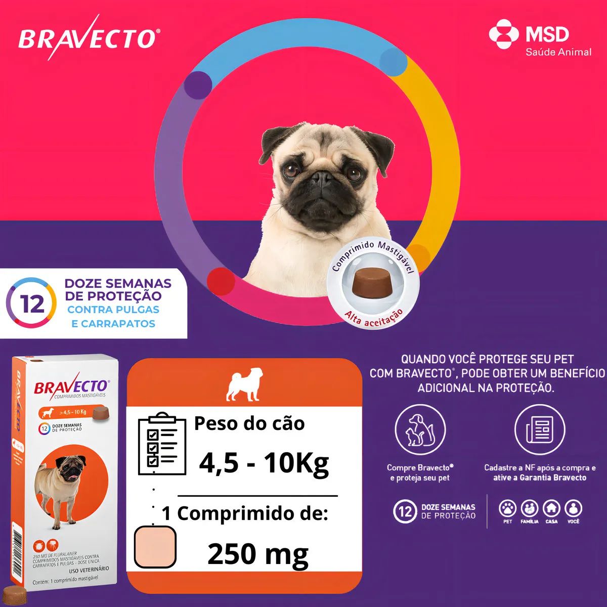 Diga adeus às infestações de pulgas e carrapatos com Bravecto, o comprimido mastigável que oferece até 12 semanas de proteção contínua com uma única dose – quase três vezes mais do que os antipulgas mensais!