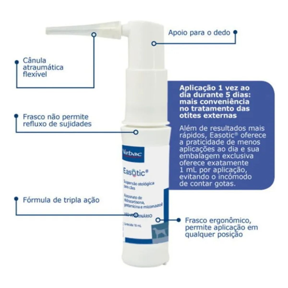 O Easotic da Virbac é a escolha ideal para tutores que buscam um tratamento eficiente e prático. Sua formulação exclusiva atua diretamente no foco da otite, proporcionando resultados visíveis em poucos dias. Com Easotic, você oferece ao seu cão o cuidado que ele merece, promovendo uma recuperação rápida e um retorno à sua rotina de brincadeiras e alegria.