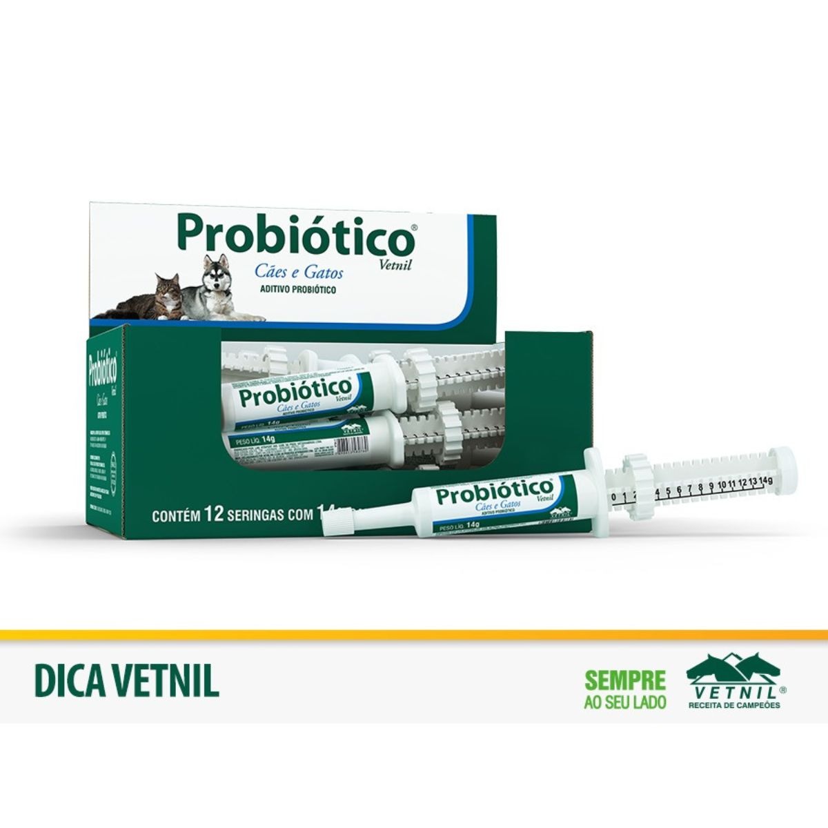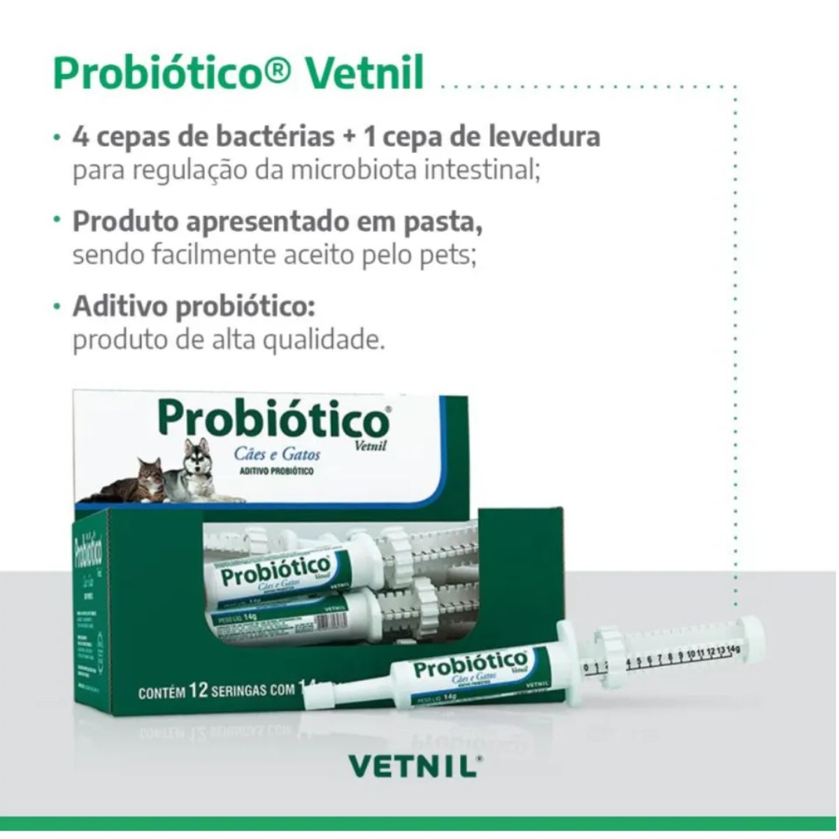 O Probiotico Vetnil e um suplemento alimentar de alta qualidade desenvolvido pela Vetnil, referencia no mercado veterinario brasileiro ha mais de 25 anos. Este aditivo probiotico em pasta foi especialmente formulado para auxiliar na regulacao da microbiota intestinal de caes e gatos, promovendo uma saude digestiva completa para seu pet.