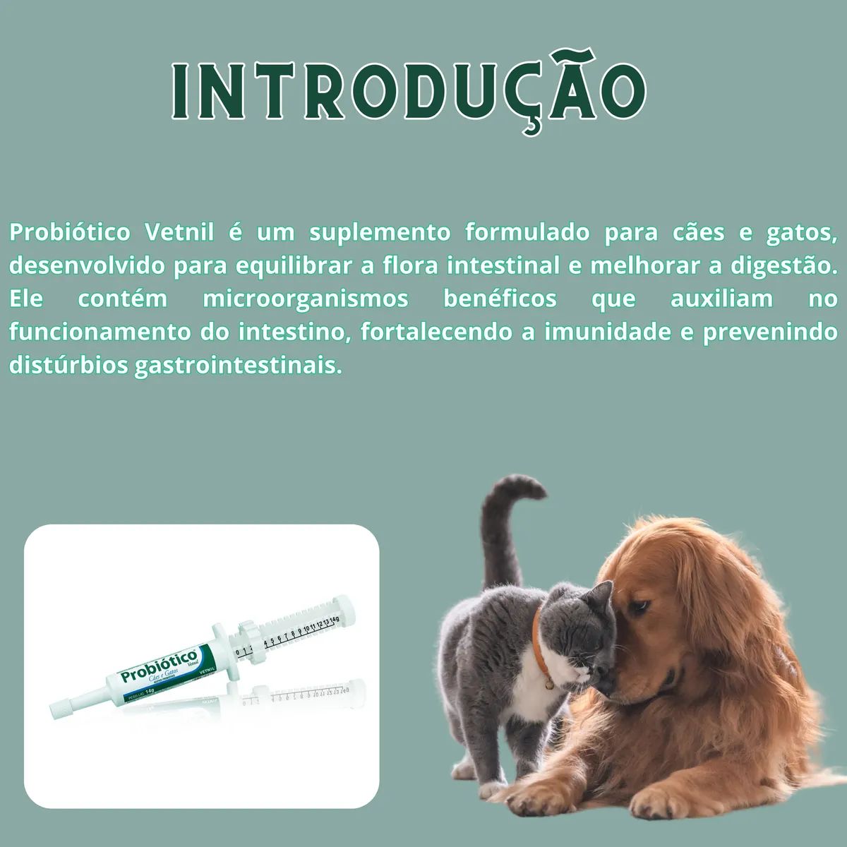 O Probiotico Vetnil e um suplemento alimentar de alta qualidade desenvolvido pela Vetnil, referencia no mercado veterinario brasileiro ha mais de 25 anos. Este aditivo probiotico em pasta foi especialmente formulado para auxiliar na regulacao da microbiota intestinal de caes e gatos, promovendo uma saude digestiva completa para seu pet.