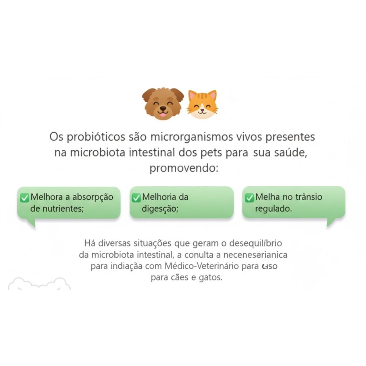 Fortalecimento do Sistema Imunologico Uma microbiota intestinal saudavel esta diretamente relacionada a imunidade. Com o uso regular, seu pet fica mais resistente a doencas e infeccoes, apresentando melhor qualidade de vida.