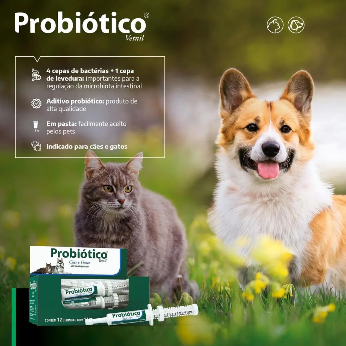 O Probiotico Vetnil e um suplemento alimentar de alta qualidade desenvolvido pela Vetnil, referencia no mercado veterinario brasileiro ha mais de 25 anos. Este aditivo probiotico em pasta foi especialmente formulado para auxiliar na regulacao da microbiota intestinal de caes e gatos, promovendo uma saude digestiva completa para seu pet.