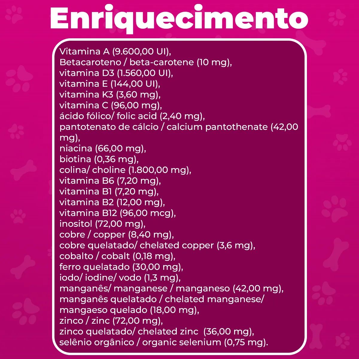 Proteína Bruta mínimo 160g – Extrato Etéreo mínimo 50g – Matéria Fibrosa máximo 60g – Cálcio 8.000 a 11.000mg – Fósforo mínimo 5.500mg – Ômega 3 mínimo 500mg – Vitamina A 9.600 UI – Vitamina D3 1.560 UI – Vitamina E 144 UI