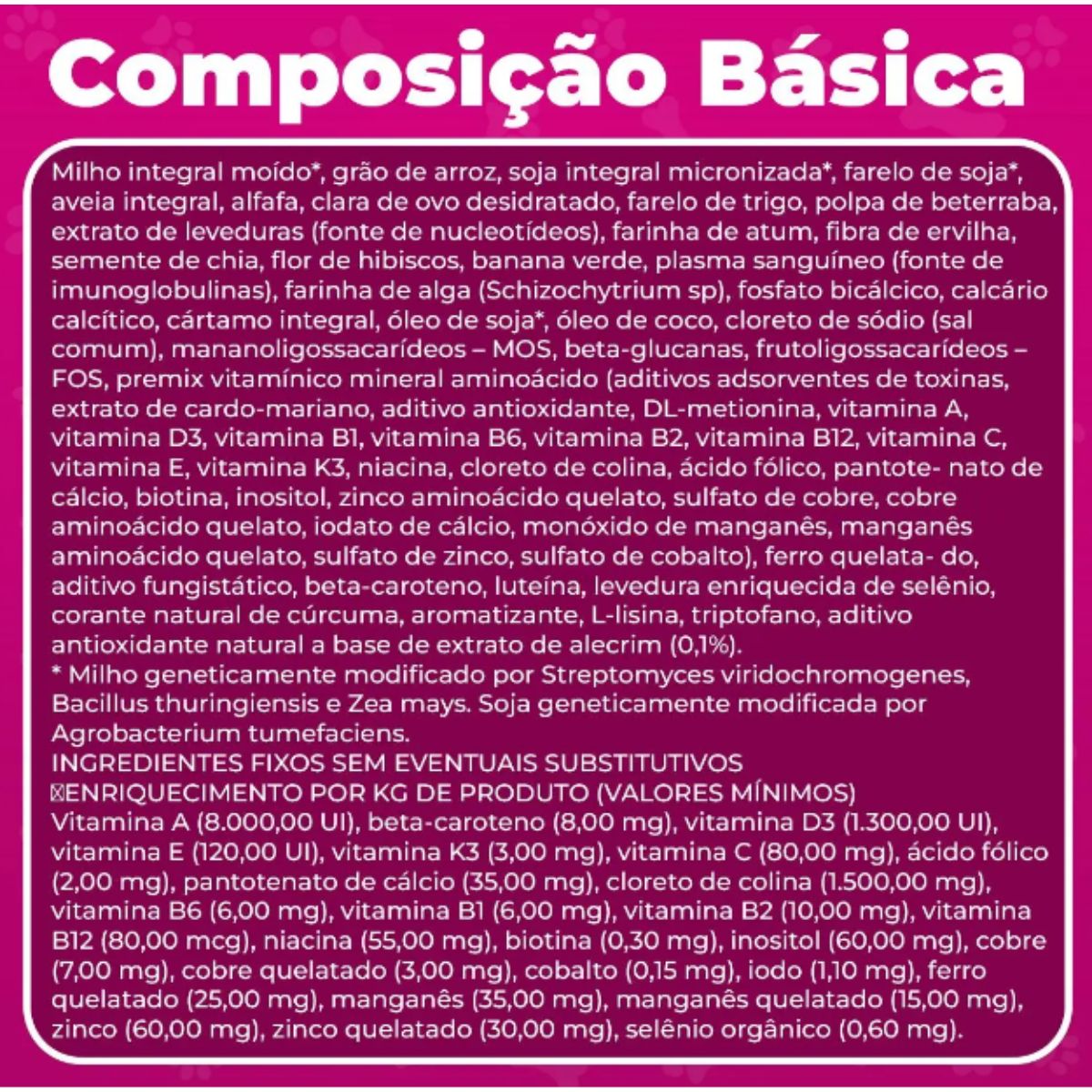 Ingredientes selecionados: Milho integral moido, grao de arroz, soja integral micronizada, farelo de soja, aveia integral, alfafa desidratada, levedura seca de cerveja, oleo de soja refinado, fosfato bicalcico, calcario calcitico, sal comum, premix vitaminico mineral.