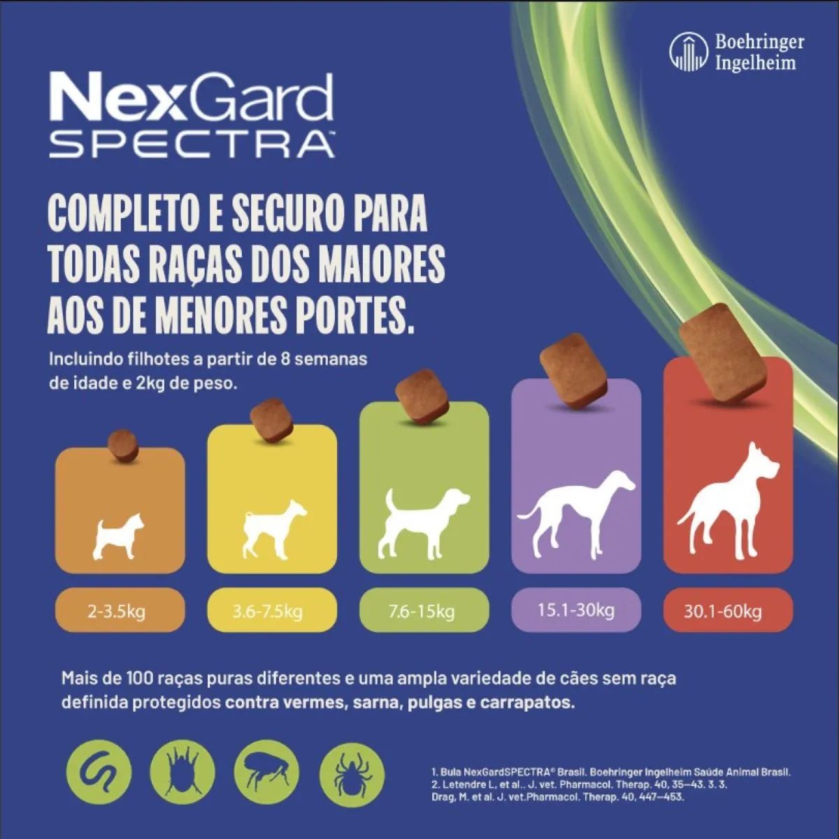 Ação completa contra pulgas, carrapatos, sarnas e vermes intestinais.