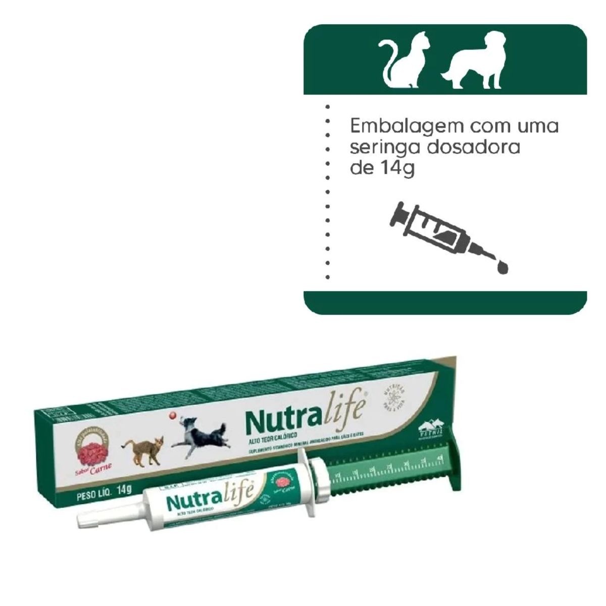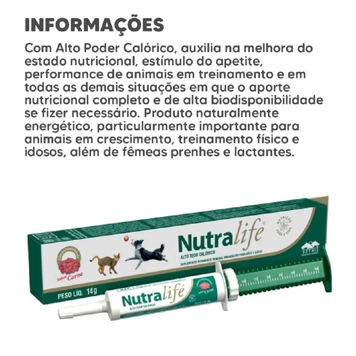 Nutralife® é um suplemento vitamínico de alto teor calórico para cães e gatos. Indicado para a suplementação rápida e efetiva de nutrientes, auxilia na melhora do estado nutricional, estímulo do apetite, performance de animais em treinamento e em situações que requerem aporte nutricional completo e de alta biodisponibilidade. É energético, ideal para animais em crescimento, treinamento físico, idosos, fêmeas prenhes e lactantes.