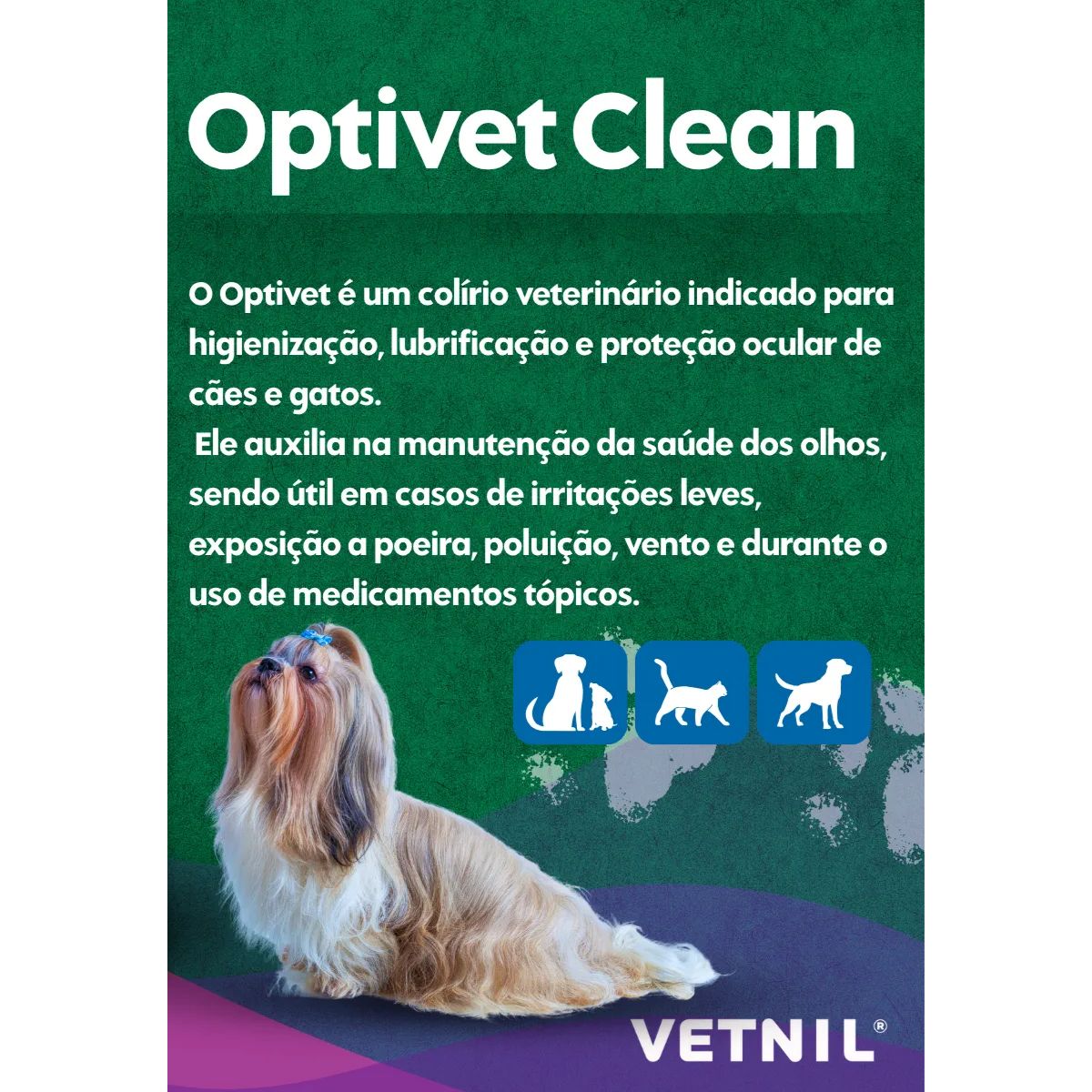 O Optivet Clean é a solução profissional desenvolvida pela Vetnil, líder brasileira em produtos veterinários, para a higiene periocular diária de cães e gatos. Com formulação especial e pH balanceado, este spray remove com eficácia secreções oculares, crostas, sujidades e manchas de lágrima, proporcionando limpeza profunda e segura na região ao redor dos olhos do seu pet.
