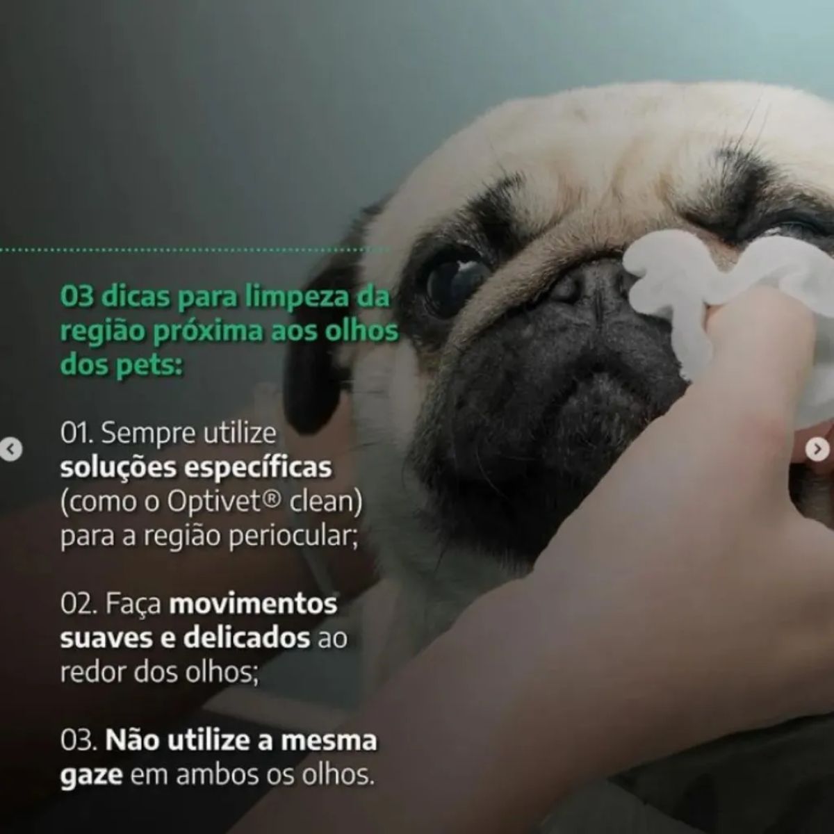 Prevenção de Problemas Oculares A limpeza periocular regular com Optivet Clean previne o acúmulo de secreções que podem levar a conjuntivites, blefarites e outras infecções oculares. Manter a região limpa é essencial para a saúde ocular do seu pet.