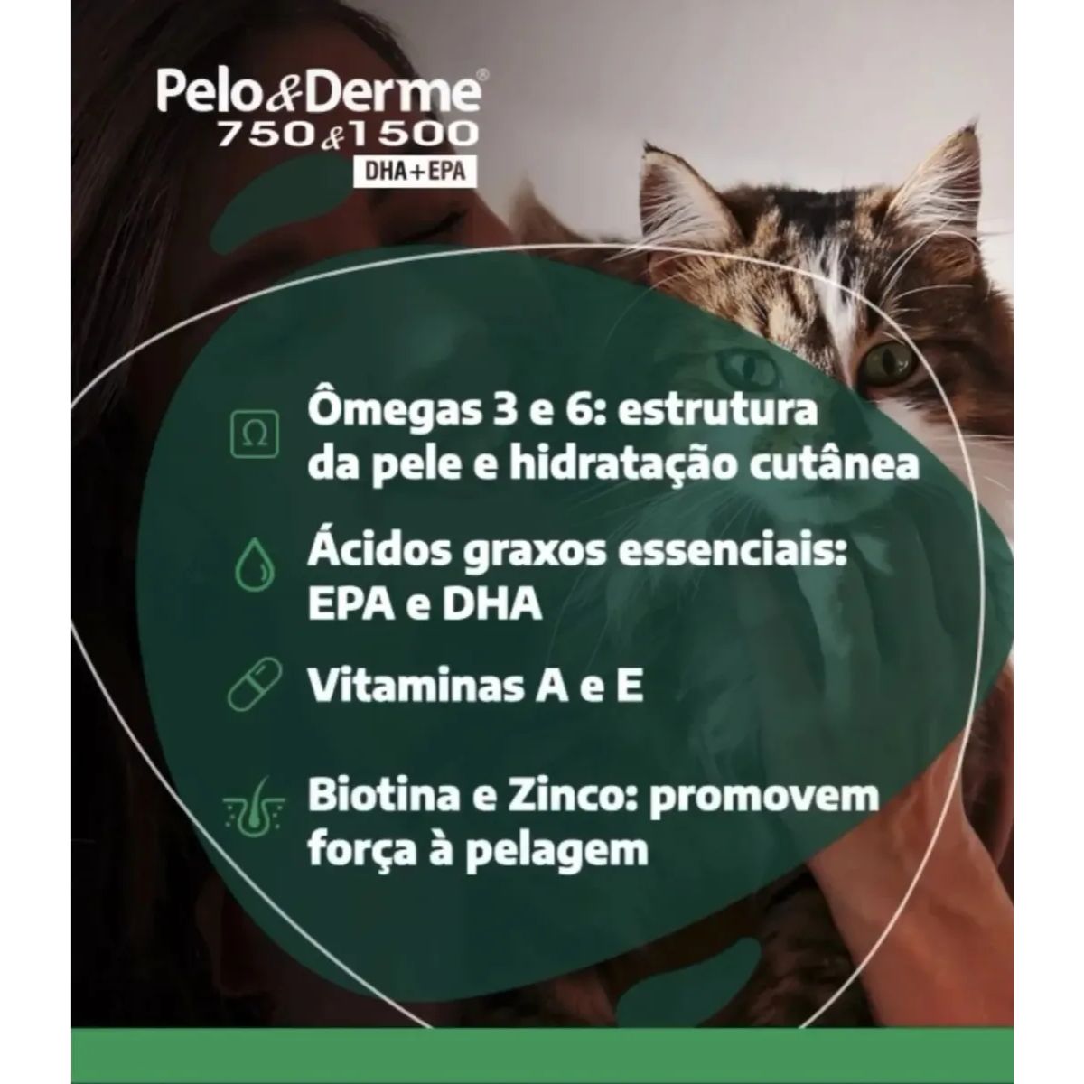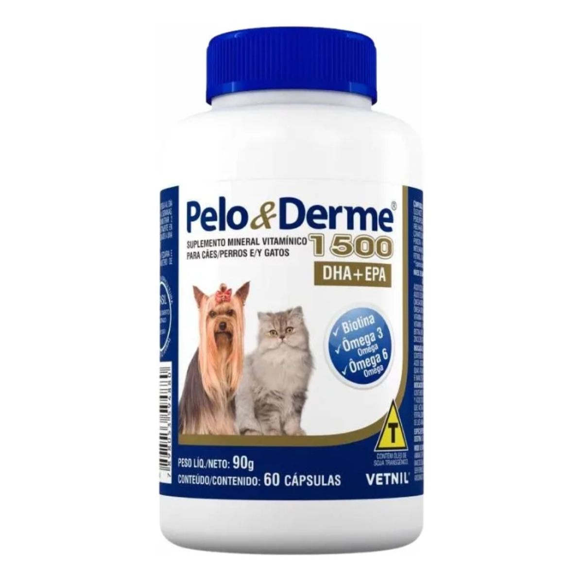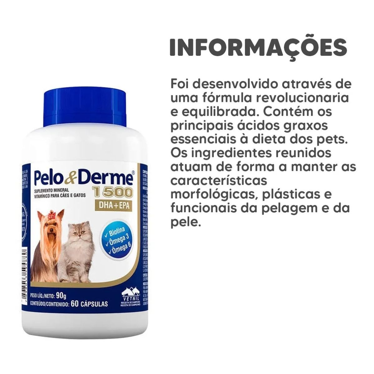 O Pelo e Derme 1500 é uma fórmula que contém ácidos graxos essenciais à dieta de cães e gatos, associados à Biotina, Zinco, Vitamina A e Vitamina E, elementos que, quando em conjunto, atuam mantendo ideais as características da pelagem e da pele.