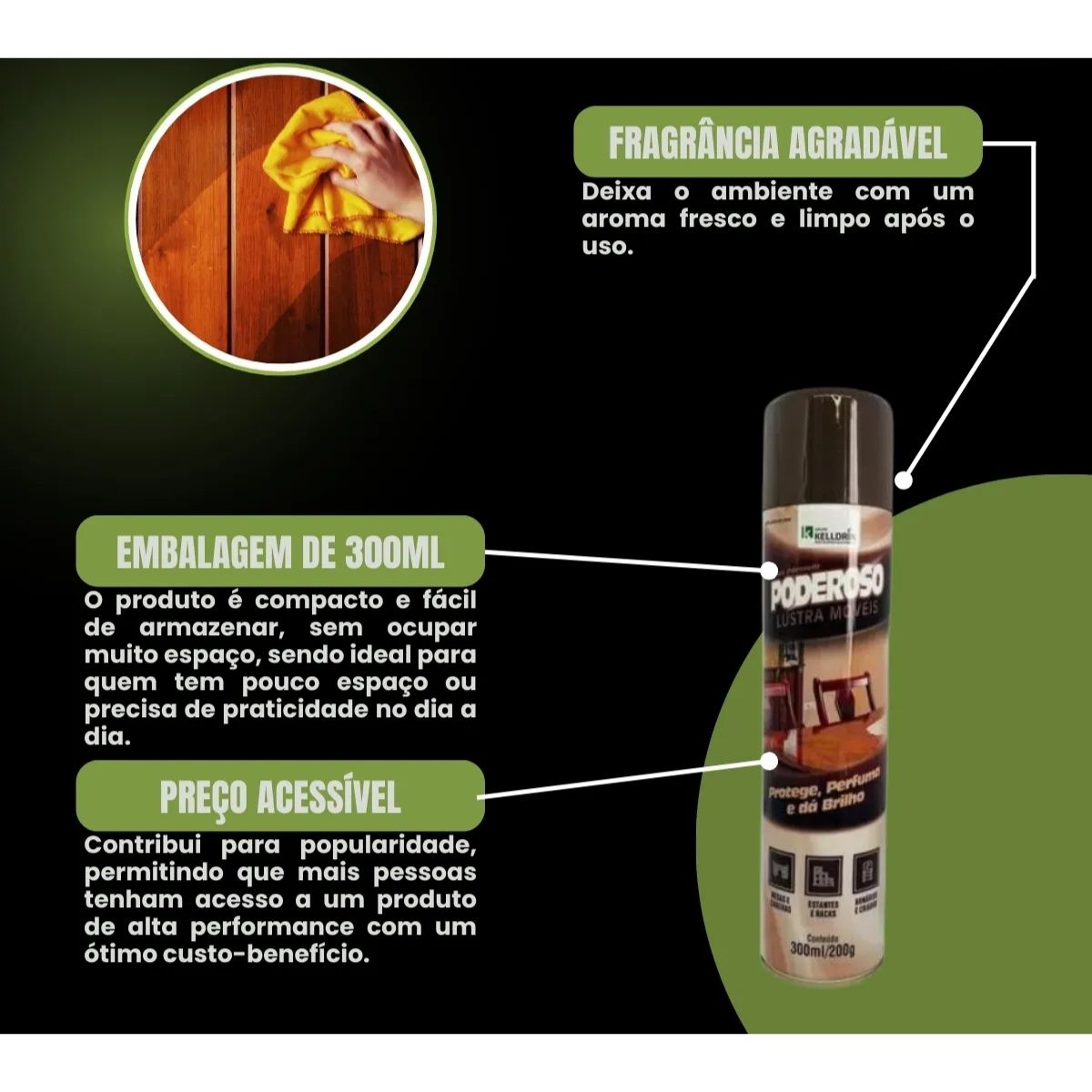 Com uma prática embalagem de 300ml, o uso é mais preciso e econômico. Sua ação é rápida e eficiente, proporcionando brilho instantâneo sem deixar resíduos pegajosos, ideal para superfícies de madeira, metal, plástico e outros materiais.