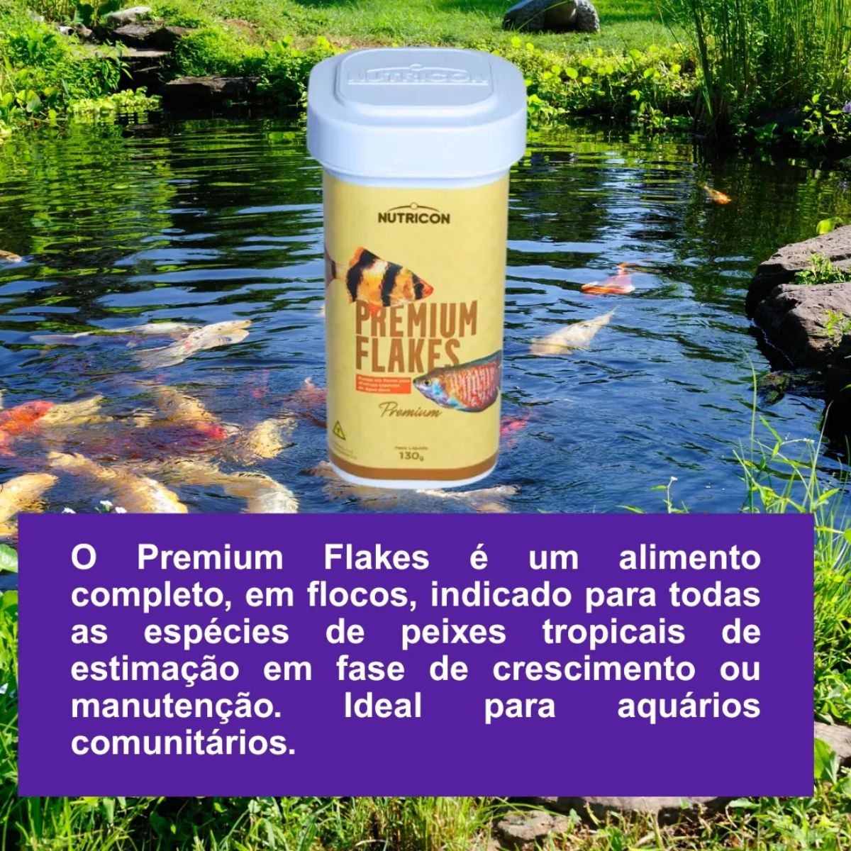 Mantenha seu aquário saudável, bonito e cheio de vida com Premium Flakes, o alimento completo em flocos desenvolvido para todas as espécies de peixes tropicais, seja na fase de crescimento ou manutenção.