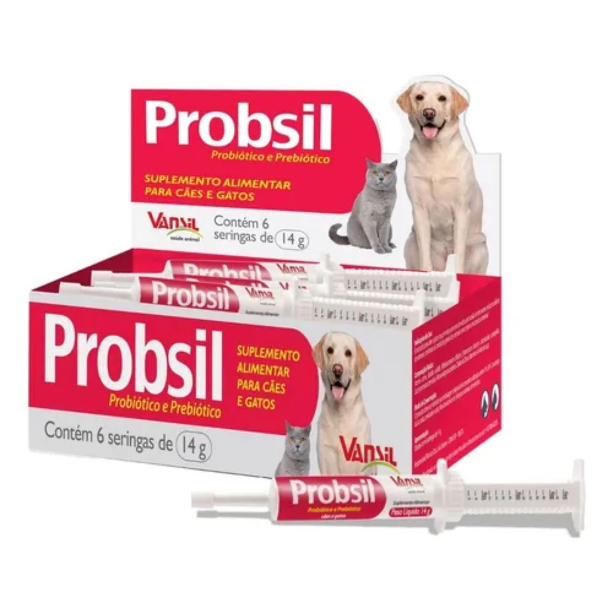 Probsil é um suplemento indicado para cães e gatos debilitados por situações de estresse ou na recomposição da microbiota intestinal.